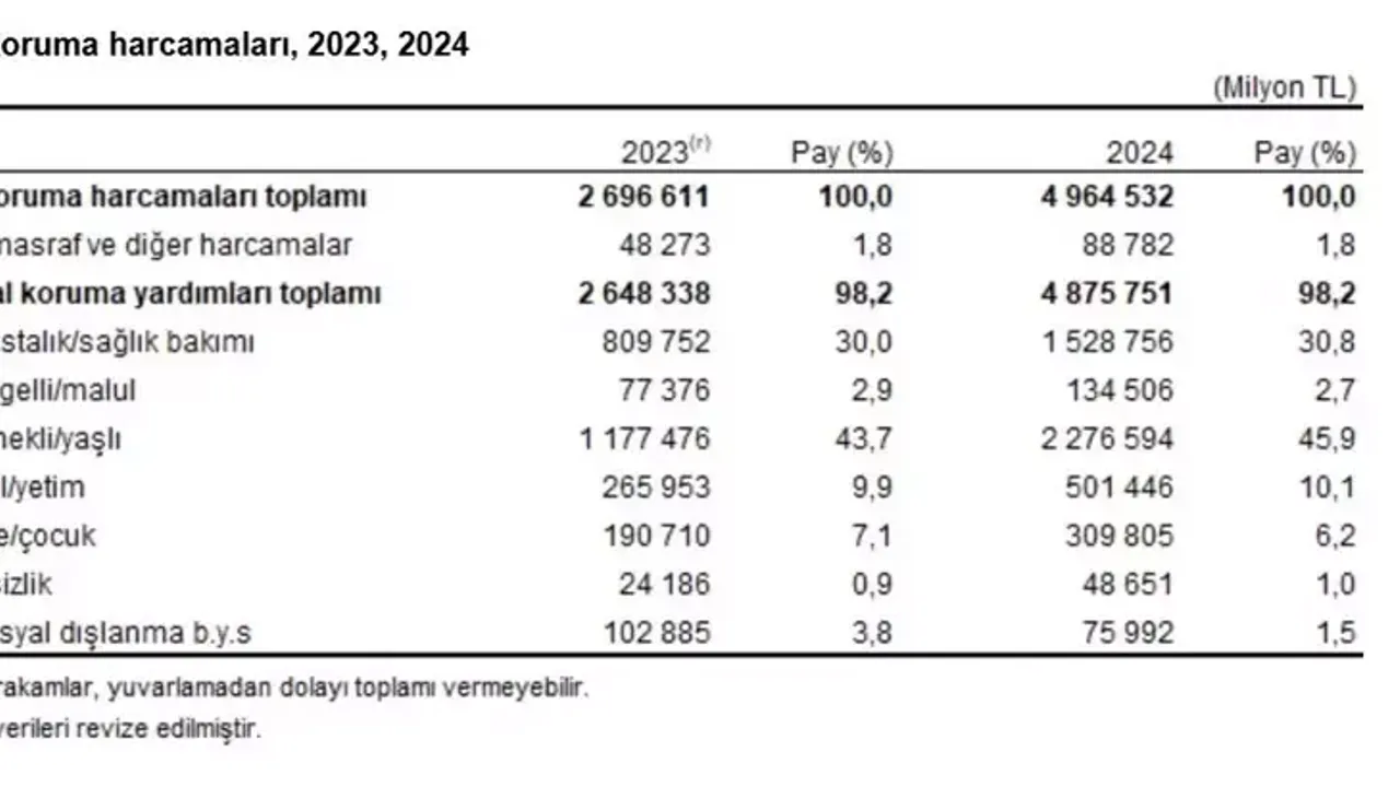 Harcamaların yüzde 98,2’si sosyal koruma yardımları olarak dağıtılırken, en büyük pay emekli ve yaşlılara yapıldı. Sosyal koruma harcamalarının GSYH içindeki payı yüzde 11,1, yardımların payı ise yüzde 10,9 olarak gerçekleşti.