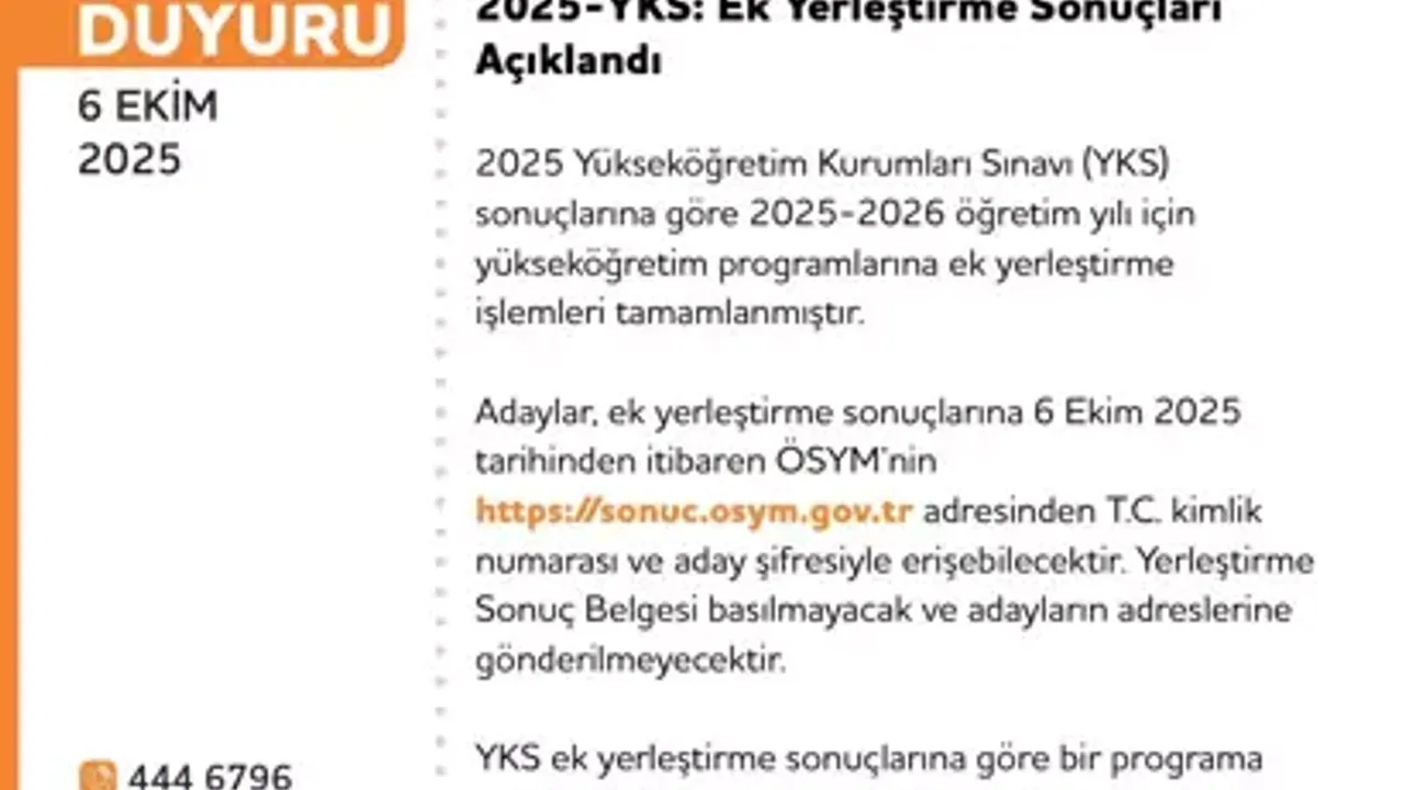 Adaylar, ek yerleştirme sonuçlarına 6 Ekim 2025 tarihinden itibaren ÖSYM’nin resmi internet sitesi üzerinden T.C. kimlik numarası ve aday şifresi ile ulaşabilecek. Sonuç belgeleri basılmayacak ve adayların adreslerine gönderilmeyecek. Kayıt hakkı kazanan öğrenciler için kayıt işlemleri 10-17 Ekim tarihleri arasında yapılacak, elektronik kayıtlar ise 10-12 Ekim tarihleri arasında gerçekleşecek.
