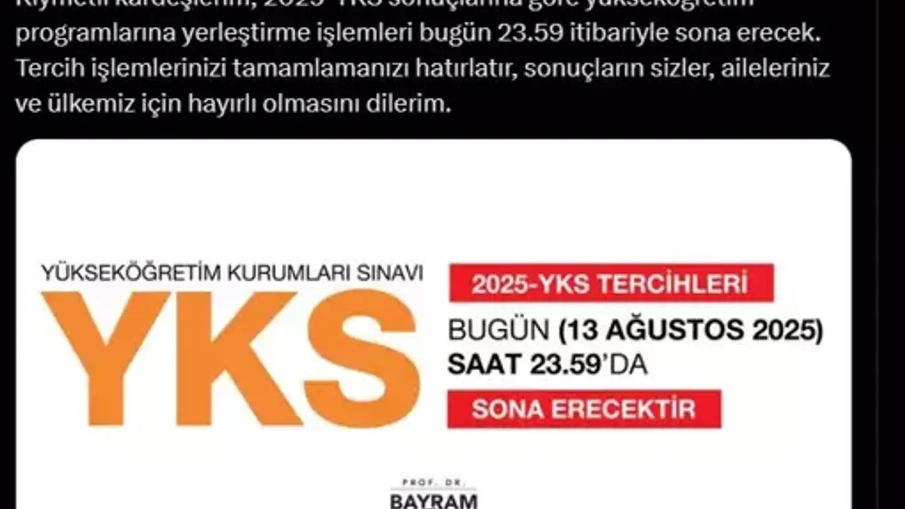ÖSYM Başkanı Bayram Ali Ersoy, tercih sürecinin son gününde sosyal medya üzerinden bir hatırlatma yaparak, “Kıymetli kardeşlerim, 2025-YKS sonuçlarına göre yükseköğretim programlarına yerleştirme işlemleri bugün 23.59 itibariyle sona erecek. Tercih işlemlerinizi tamamlamanızı hatırlatır, sonuçların sizler, aileleriniz ve ülkemiz için hayırlı olmasını dilerim” ifadelerini kullandı.