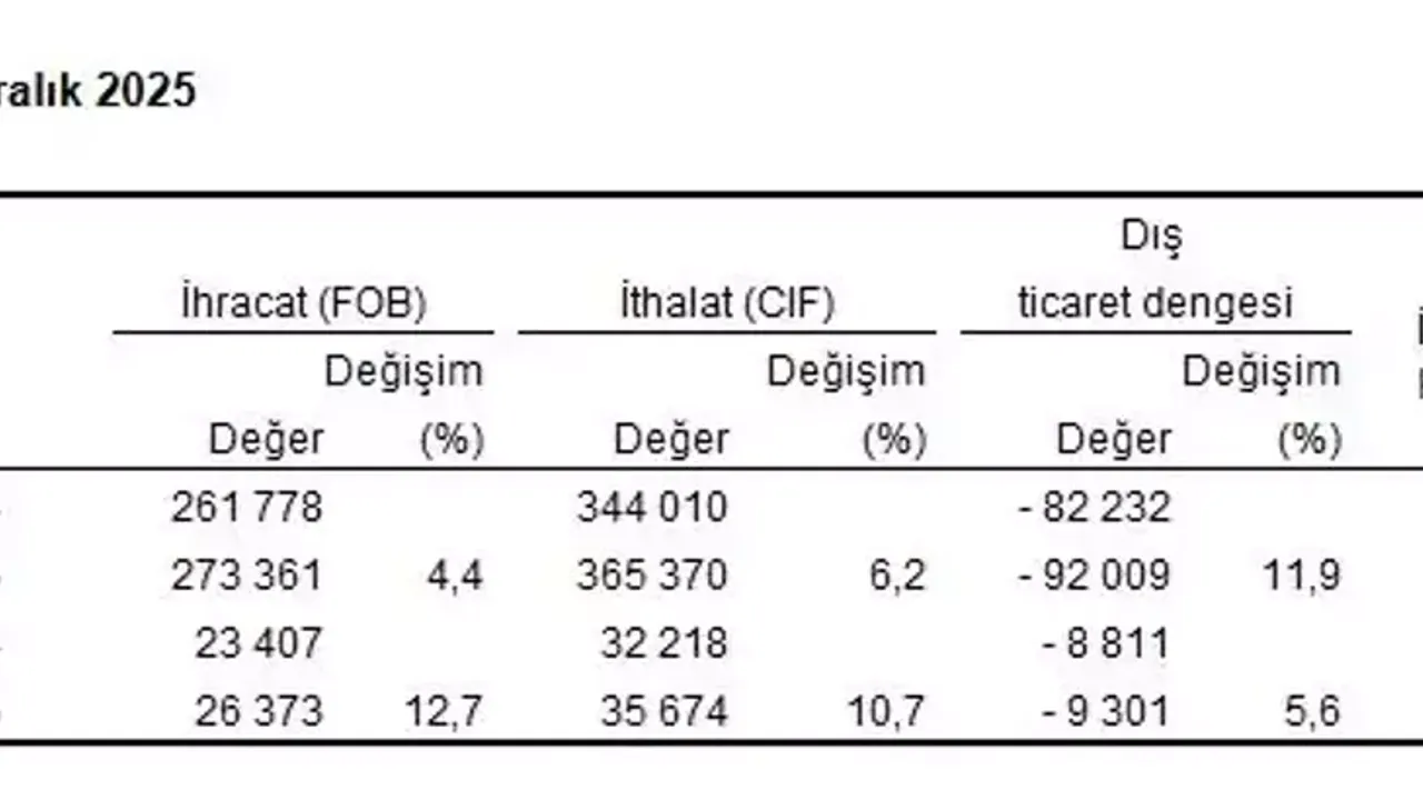 Aralık 2025 dönemine bakıldığında, ihracatta dikkat çekici bir artış yaşandığı görüldü. Buna göre, ihracat bir önceki yılın aynı ayına göre yüzde 12,7 artarak 26 milyar 373 milyon dolar oldu. Aynı dönemde ithalat ise yüzde 10,7 artışla 35 milyar 674 milyon dolara ulaştı. Yılın son ayında dış ticaret hacminde yaşanan bu artış, ekonomik hareketliliğin sürdüğüne işaret etti.