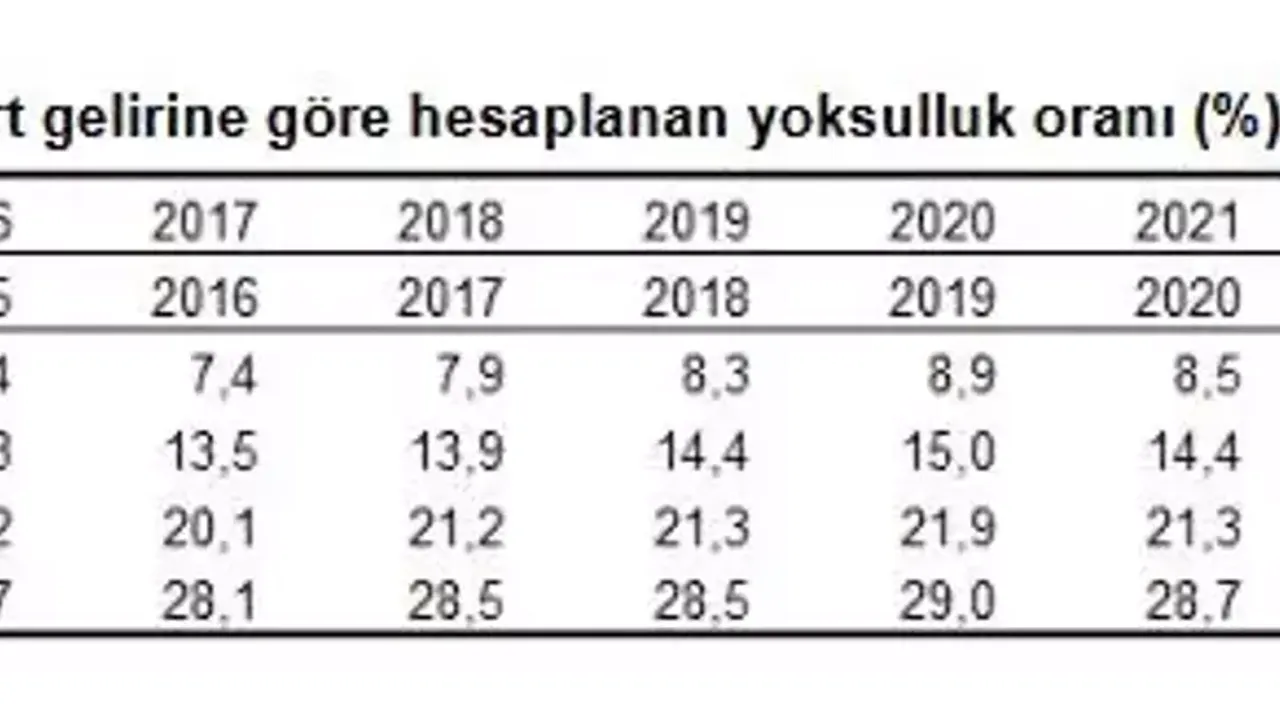 Buna göre, medyan gelirin yüzde 50’si baz alınarak hesaplanan göreli yoksulluk oranı bir önceki yıla göre 0,6 puan azalarak yüzde 13 olarak gerçekleşti. Medyan gelirin yüzde 60’ı baz alındığında yoksulluk oranı yüzde 20,6, yüzde 40’ı baz alındığında ise yüzde 6,2 oldu. Yüzde 70’lik sınırda yoksulluk oranı ise yüzde 28,7 olarak kaydedildi.