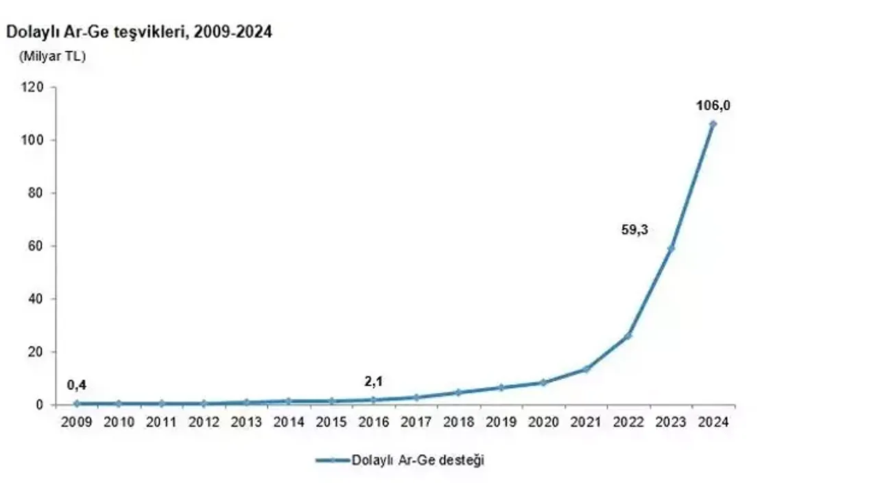 Buna göre, araştırma ve geliştirme (Ar-Ge) faaliyetlerine yönelik toplam vergi teşviki, 2023 yılına göre yüzde 78,6 artarak 105 milyar 977 milyon TL’ye ulaştı.