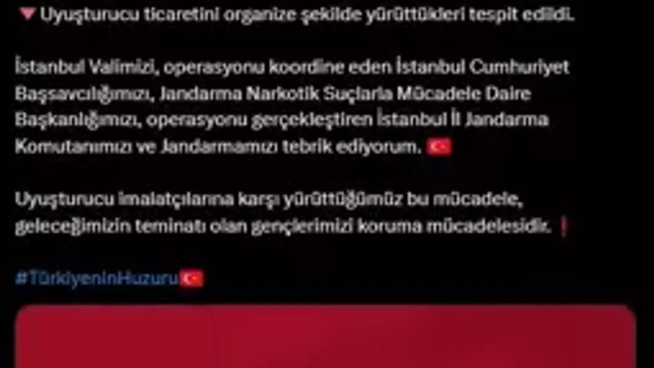 Bakan A.Y., paylaşımında, “İstanbul’da 2. Operasyon: Jandarmamızın düzenlediği bu operasyonda; 7 milyon 896 bin uyuşturucu hap ile 63 kg ham madde ele geçirdik. Yakalanan şüphelilerin organize uyuşturucu ticareti yaptıkları tespit edildi. İstanbul Valimizi, Cumhuriyet Başsavcılığımızı, Jandarma Narkotik Suçlarla Mücadele Daire Başkanlığımızı, İstanbul İl Jandarma Komutanlığımızı ve tüm jandarma personelimizi tebrik ediyorum. Bu mücadele, gençlerimizi koruma amacımızdır.” ifadelerine yer verdi.