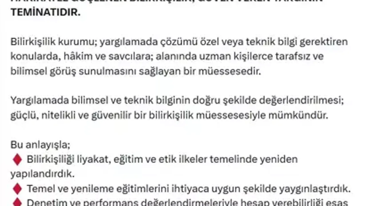 Bakan Tunç, sosyal medya hesabından yaptığı paylaşımda, bilirkişiliğin yargının güvenilirliğinin teminatı olduğunu belirtti. Bilirkişilik kurumunun, yargılamada özel veya teknik bilgi gerektiren konularda hakim ve savcılara tarafsız ve bilimsel görüş sunulmasını sağlayan bir yapı olduğunu vurgulayan Tunç, bu sayede bilimsel ve teknik bilginin doğru şekilde değerlendirilmesinin mümkün olduğunu ifade etti.