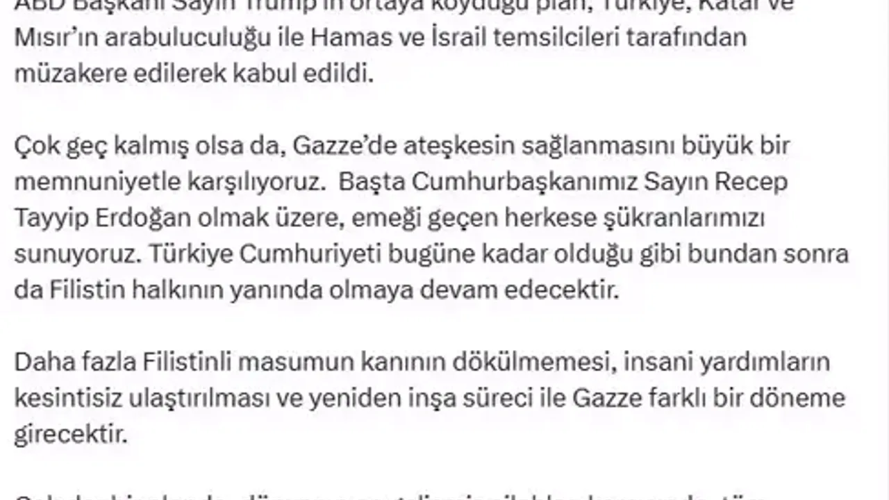 “Çok geç kalmış olsa da Gazze’de ateşkesin sağlanmasını büyük bir memnuniyetle karşılıyoruz” diyen Yılmaz, sürece katkı sağlayan başta Cumhurbaşkanı Recep Tayyip Erdoğan olmak üzere herkese teşekkür etti.