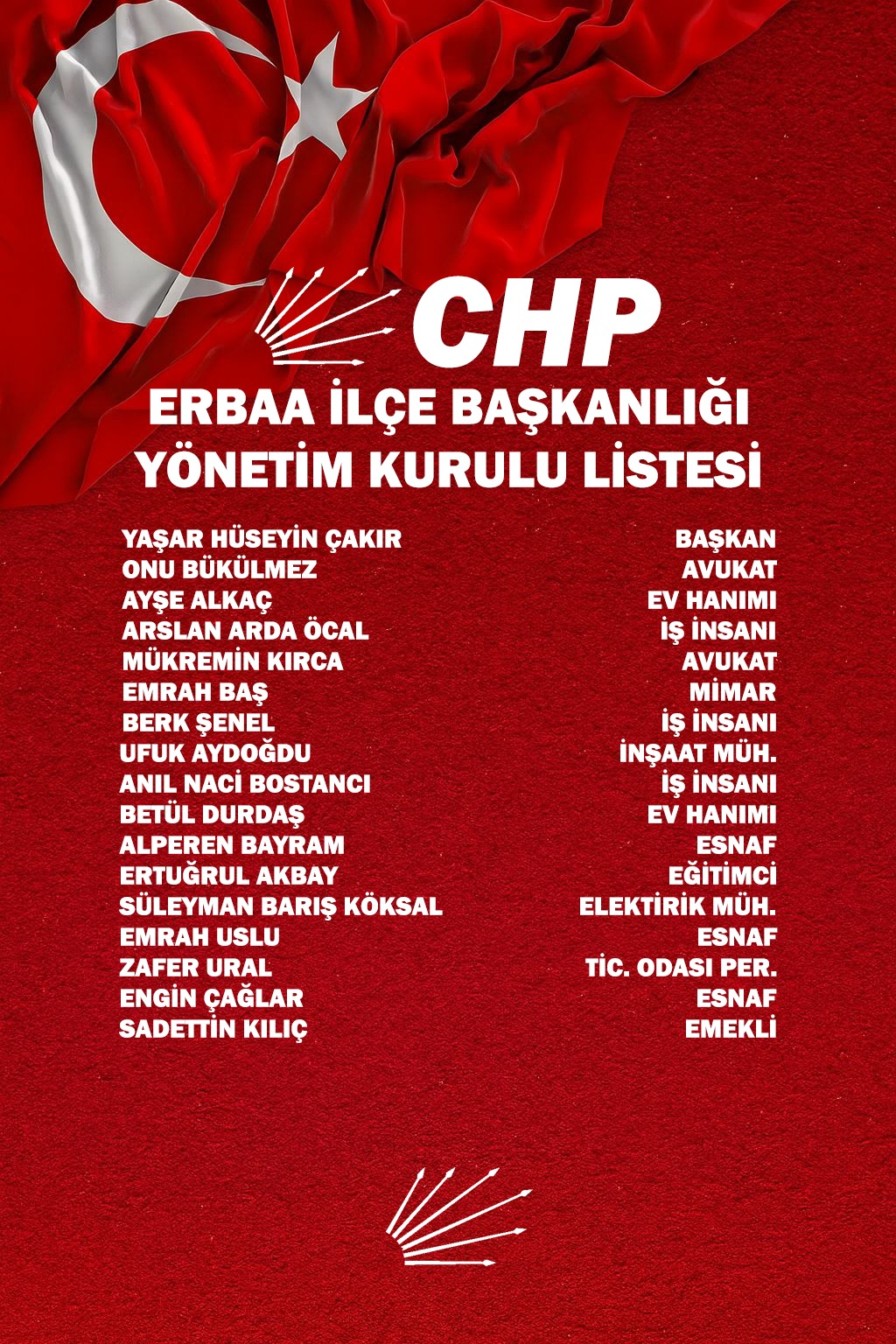 Erbaa'da CHP yönetiminde yer alan isimler şöyle: Onur Bükülmez, Ayşe Alkaç, Arslan Arda Öcal, Mükremin Kırca, Emrah Baş, Berk Şenel, Ufuk Aydoğdu, Anıl Naci Bostancı, Betür Durdaş, Alperen Bayram, Ertuğrul Akbay, Süleyman Barış Köksal, Emrah Uslu, Zafer Ural, Engin Çağlar, Saadettin Kılıç.