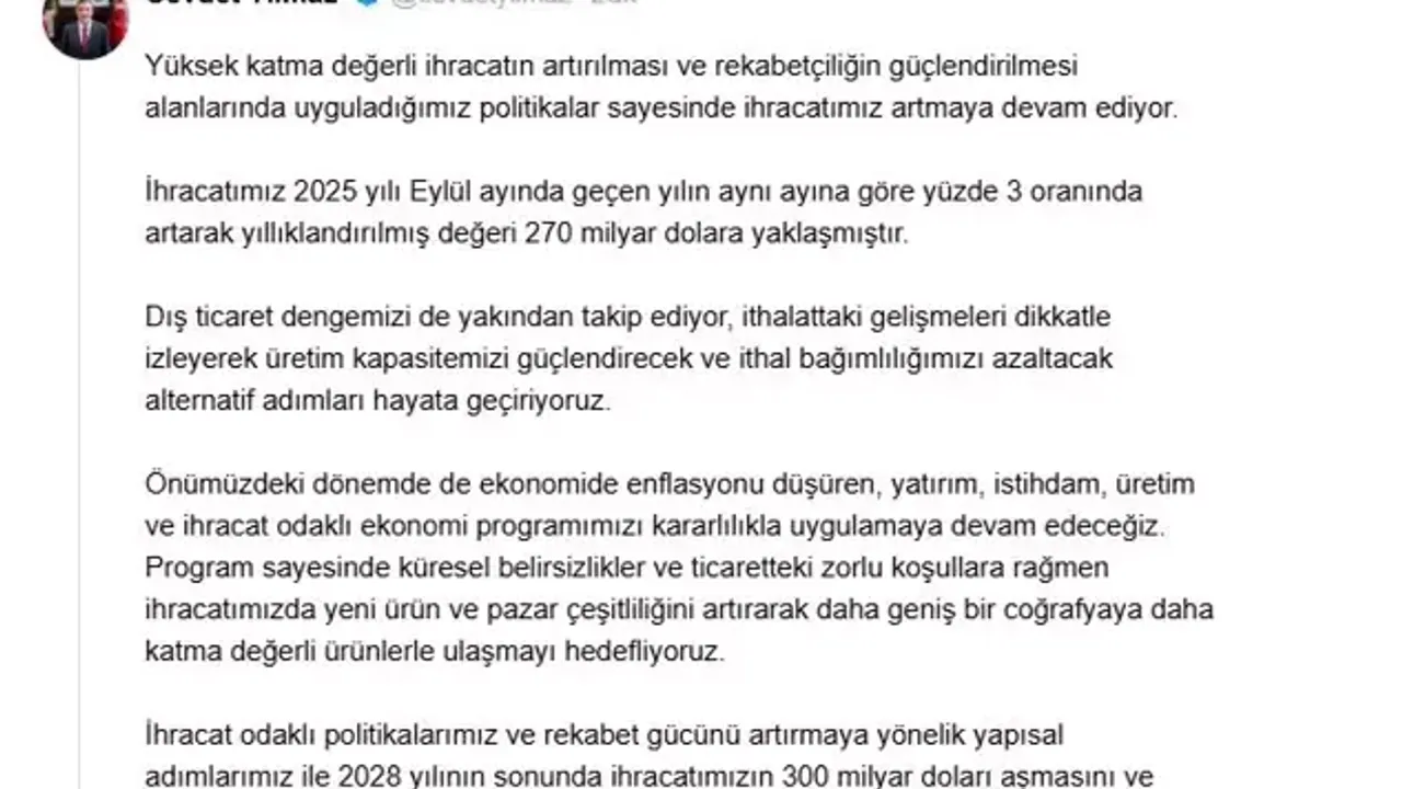 Cumhurbaşkanı Yardımcısı Yılmaz, eylül ayı dış ticaret verilerine ilişkin sosyal medya hesabından yaptığı açıklamada, ihracatın artmaya devam ettiğini vurgulayarak, “2025 yılı Eylül ayında ihracatımız, geçen yılın aynı ayına göre yüzde 3 artarak yıllıklandırılmış bazda 270 milyar dolara yaklaştı” dedi.