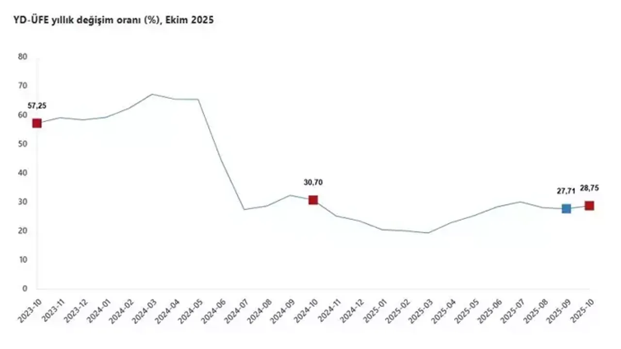 Buna göre yurt dışı üretici fiyatları yıllık yüzde 28,75, aylık yüzde 0,90 arttı. Aralık 2024’e göre artış ise yüzde 28,69 olarak kaydedildi.