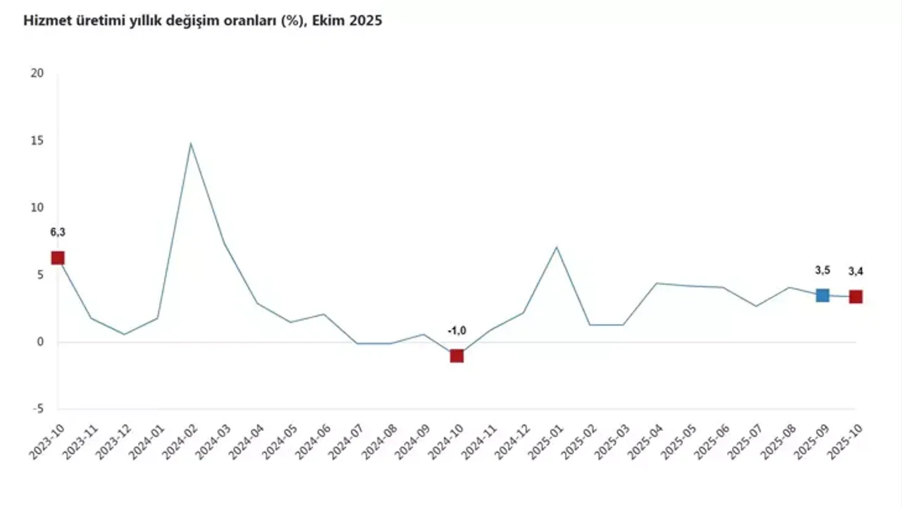 Buna göre, hizmet üretimi yıllık bazda yüzde 3,4 artarken, bir önceki aya göre yüzde 0,3 azaldı.