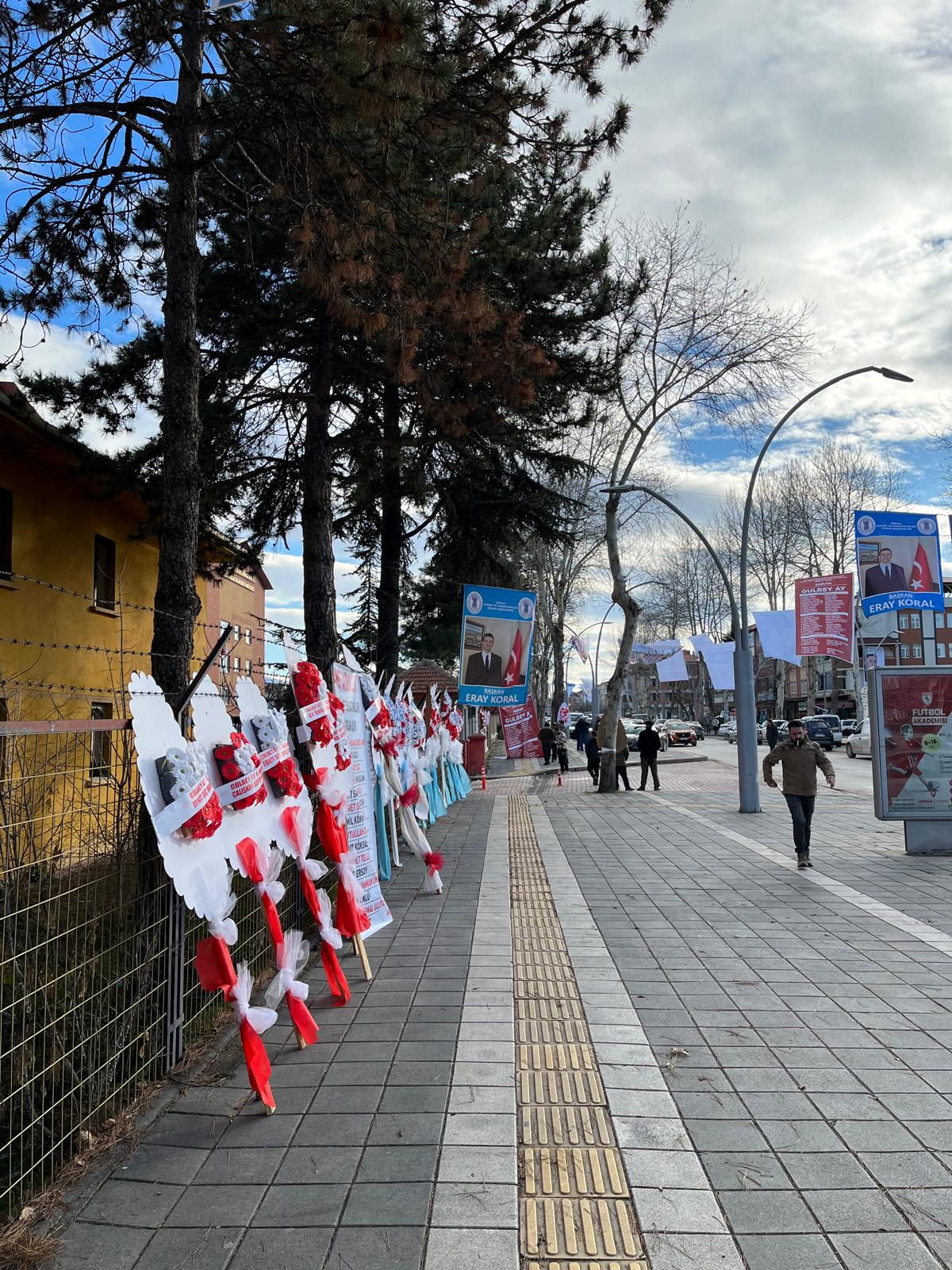 Seçim bölgesindeki yoğunluk sadece seçmenlerle sınırlı kalmadı. Okul çevresini saran ve sayısı yüzleri bulan tebrik ve başarı çelenkleri, seçim atmosferinin ne kadar yüksek olduğunu gözler önüne serdi. Oy kullanmaya gelen vatandaşlar, çelenklere bakmadan gözünü alamıyor.