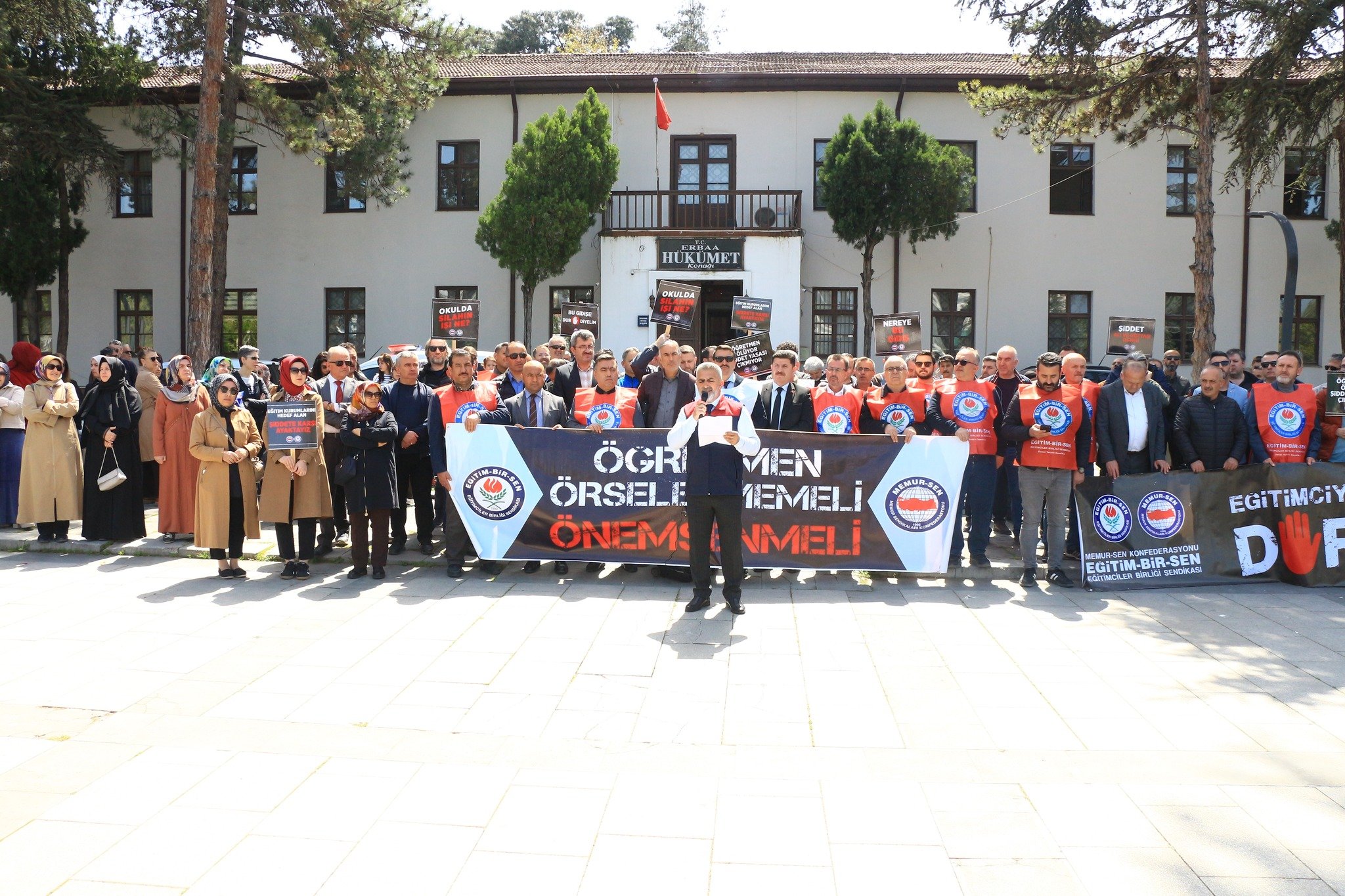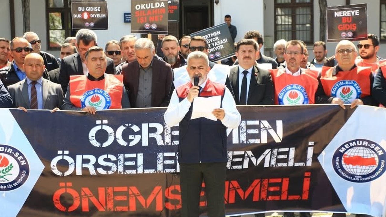 Eğitim Bir Sen Erbaa Temsilcisi İbrahim Cenik yaptığı açıklamada, “Bugün buraya Siverek Ahmet Koyuncu Mesleki ve Teknik Anadolu Lisesi’nde, eski bir öğrenci tarafından gerçekleştirilen menfur saldırıyı protesto etmek üzere toplanmış bulunuyoruz. Bir kez daha görülmüştür ki; okullarımızda eğitimcilerimize ve öğrencilerimize yönelen şiddet olayları münferit eylemler olmaktan çıkmış, yaygın bir toplumsal sorun haline gelmiş, toplumsal çürümeyi gün yüzüne çıkarmıştır. Eğitim sistemimizin en önemli paydaşlarından biri olarak; daha iyi bir eğitim, daha iyi bir müfredat, pedagojik yöntemler, daha ileri amaçlar üzerine kafa yormamız gerekirken eğitim kurumlarında yaşanan şiddet olaylarını konuşmak durumunda kalıyoruz. Hal böyle iken yetkililer çözüm üretmekte yetersiz kalıyor veya isteksiz davranıyorlar. Eğitimciye yönelen şiddetin vaka-i âdiyeden bir hale geldiği, eğitim çağındaki çocukların şiddete başvurduğu, silaha kolayca ulaşarak pervasızca suç işlediği bir zaman dilimindeyiz. Aklına esenin, aklı kesenin ya da aklı başında olmayanın öğretmene, okul yöneticisine, eğitim çalışanına, öğrenciye şiddet uyguladığı, can güvenliğinin eğitim-öğretimin önüne geçtiği bir zemine doğru hızla yol alıyoruz. Eğitimciye şiddetin, bireysel suç vakaları olmaktan çıkarak eğitim, aile ve toplum politikalarının sorgulanmasını gerektiren bir iş güvenliği sorununa dönüştüğünü üzülerek müşahede ediyoruz” dedi.