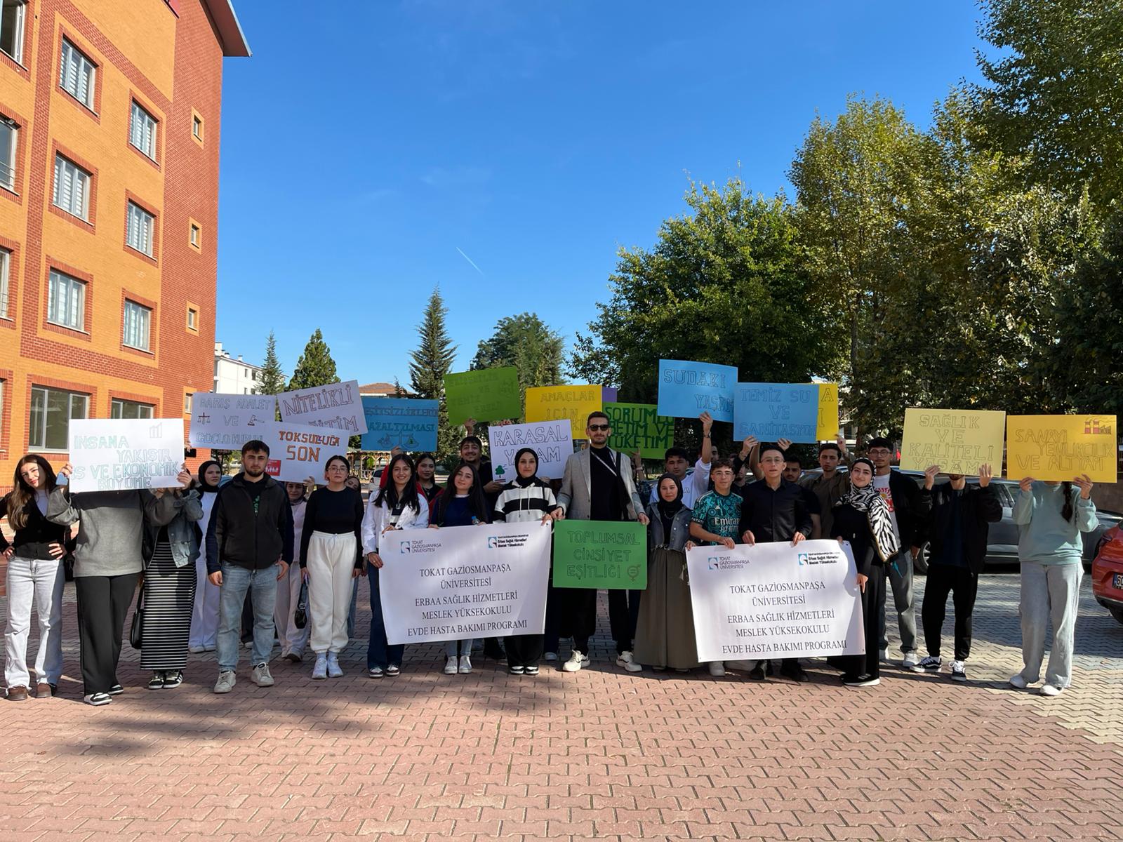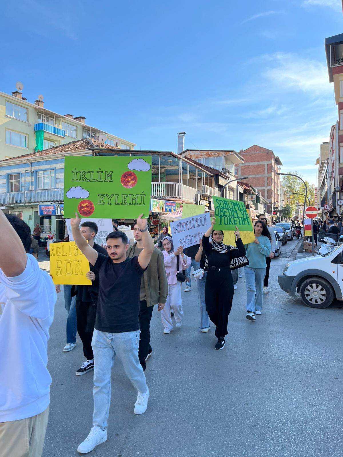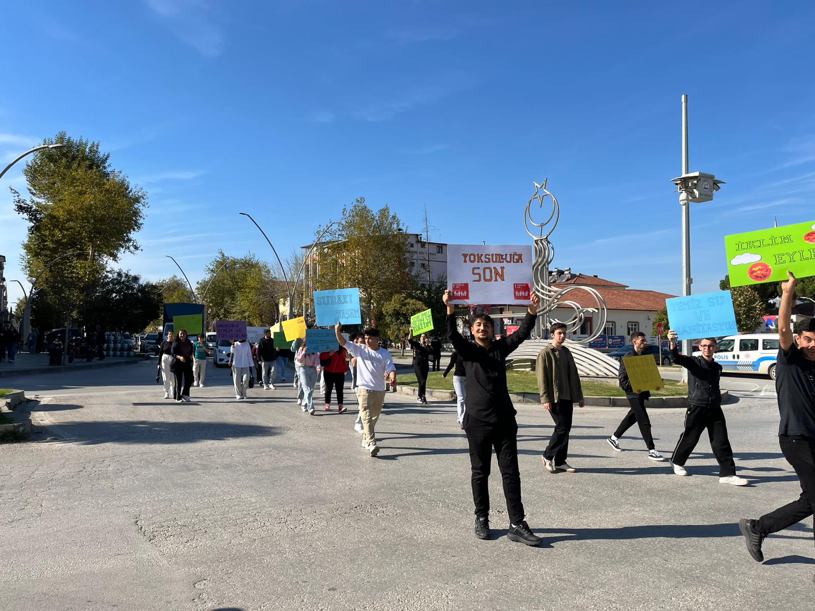 Öğr. Gör. Abdurrahim Uyanık koordinatörlüğünde gerçekleştirilen yürüyüşte, öğrenciler taşıdıkları bilgilendirici pankartlar ile hem sürdürülebilir kalkınma hedeflerini hem de bu hedeflerin milli ve manevi değerlerle olan bağını vurguladı.