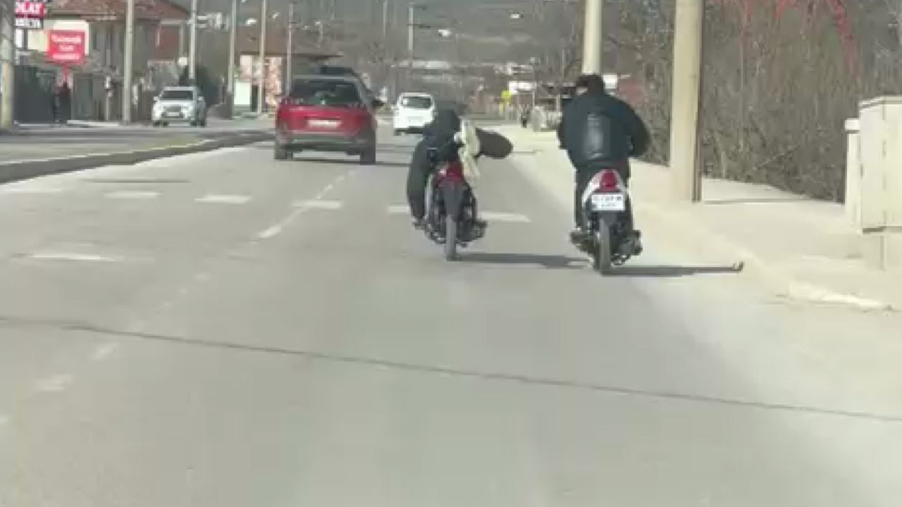 Olay, dün saat 14.30 sıralarında meydana geldi. Karayaka Bulvarı yönünde ilerleyen yan yana iki motosikletten birinin kasksız sürücüsü, aracı üzerine yüzüstü yatarak kullandı. Diğer motosikleti kullanan kasksız sürücü ise yoldan geçenler tarafından cep telefonuyla görüntülendi. Görüntülerde, yan yana ilerleyen 2 motosikletlinin kask kullanmadığı, plakasız motosikletin sürücüsünün de aracın üzerine yüzüstü yatarak seyrettiği görüldü.