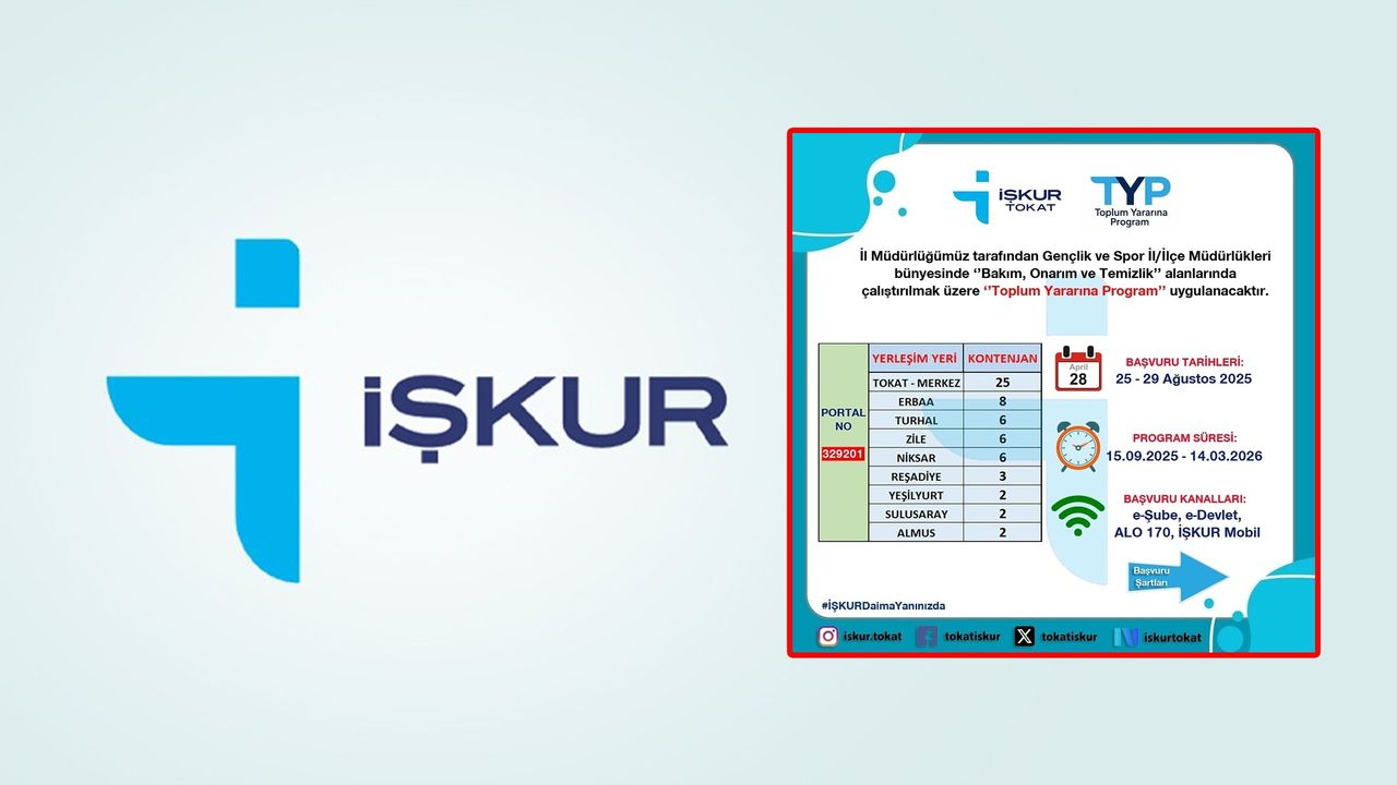 Tokat İŞKUR İl Müdürlüğü tarafından Gençlik ve Spor İl/İlçe Müdürlükleri bünyesinde “Bakım, Onarım ve Temizlik” alanlarında çalıştırılmak üzere Toplum Yararına Program (TYP) başvurularının başladığı duyuruldu. Erbaa ilçesi bu program kapsamında 8 kişilik kontenjanla yer aldı.