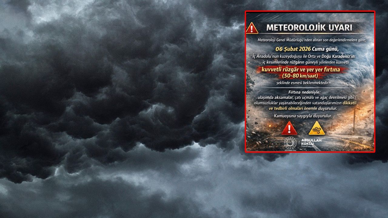 Valilikten yapılan açıklamada, rüzgarın güneyli yönlerden (lodos) kuvvetli ve yer yer kısa süreli fırtına şeklinde eseceği belirtildi. Cuma günü saat 00.00 ile 23.50 arasında etkili olacak rüzgarın hızının 50 ile 80 km/saat arasında değişmesi bekleniyor. Özellikle İç Anadolu’nun kuzeydoğusu ile Orta ve Doğu Karadeniz’in iç kesimlerinde riskin yüksek olduğu vurgulandı.