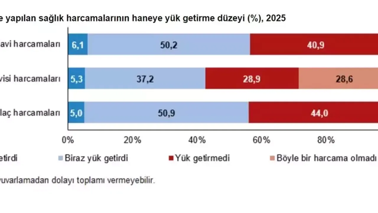 Araştırmaya göre, doktor muayene ve tedavi harcamaları hanelerin yüzde 6,1’ine “çok yük”, yüzde 50,2’sine “biraz yük” getirdi. Hanelerin yüzde 40,9’u ise bu harcamalardan etkilenmedi. Diş muayene ve tedavi harcamaları hanelerin yüzde 5,3’ünde çok, yüzde 37,2’sinde biraz yük oluştururken, yüzde 28,9’u bu harcamalardan etkilenmedi. İlaç harcamaları ise yüzde 5’lik hane için çok, yüzde 50,9’luk kesim için biraz yük oluşturdu; yüzde 44’ü ise ilaç harcamalarının hane bütçesine yük getirmediğini bildirdi.