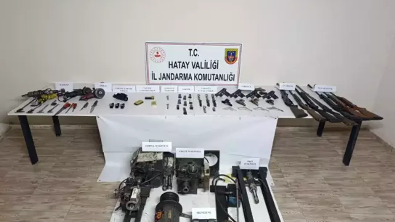 Hatay İl Jandarma Komutanlığı’nın istihbari çalışmaları sonucunda yapılan baskında; 8 tabanca, 2 tabanca namlusu, 7 tabanca kapak takımı, 99 adet 7,65 mm fişek, 3 av tüfeği, 4 havalı tüfek, 3 tabanca optik cihazı ve 1 optik gece görüş cihazı bulundu. Ayrıca silah yapımında kullanıldığı belirlenen torna, freze, pres, spiral ve matkap makineleri ile çok sayıda parça ve malzemeye el konuldu.