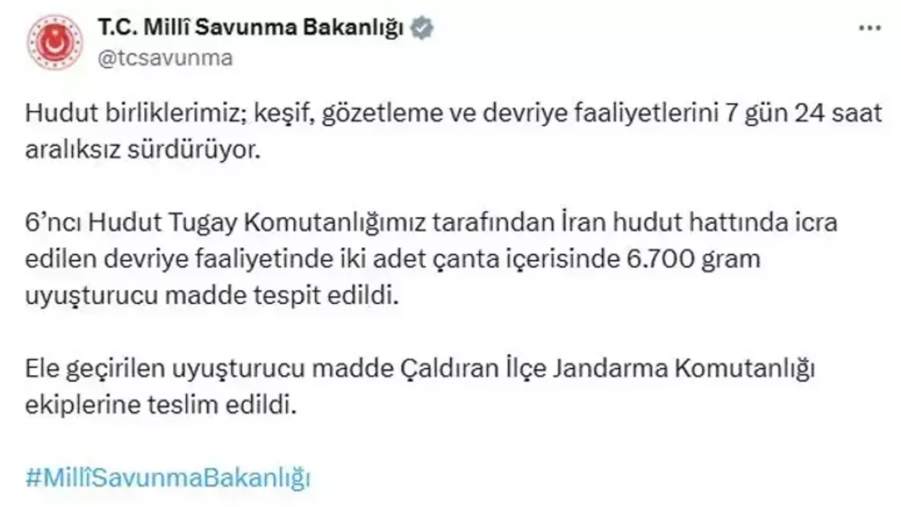 MSB'nin sosyal medya hesabı üzerinden yapılan açıklamada, “Hudut birliklerimiz; keşif, gözetleme ve devriye faaliyetlerini 7 gün 24 saat aralıksız sürdürüyor. 6'ncı Hudut Tugay Komutanlığımız tarafından İran hudut hattında icra edilen devriye faaliyetinde, iki adet çanta içerisinde 6 kilo 700 gram uyuşturucu madde tespit edildi” denildi.
