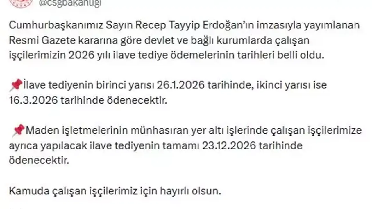 Buna göre, devlet ve bağlı kurumlarda çalışan işçilerin ilave tediyesinin birinci yarısı 26 Ocak 2026 tarihinde, ikinci yarısı ise 16 Mart 2026 tarihinde ödenecek. Ayrıca maden işletmelerinde münhasıran yer altı işlerinde çalışan işçiler için ilave tediyenin tamamı 23 Aralık 2026 tarihinde verilecek. Bakanlık, yaptığı açıklamada, “Kamuda çalışan işçilerimiz için hayırlı olsun” ifadelerini kullandı.
