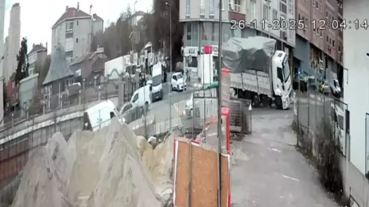 Güvenlik kameralarına yansıyan kazada sürücü yara almazken, kamyondan yola sızan motor yağı araç sürücüleri ve yayalar için zor anlar yaşattı.