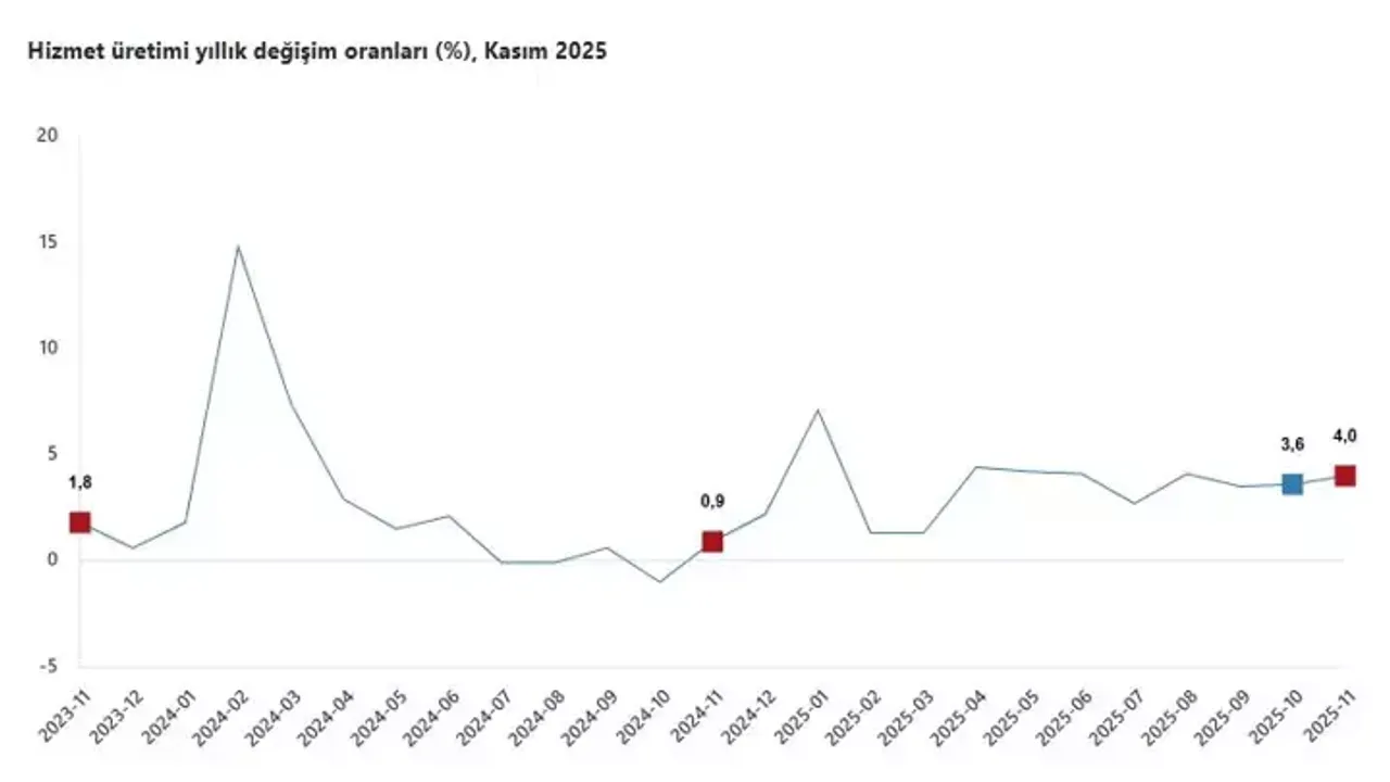 Buna göre, hizmet üretimi kasım ayında bir önceki yılın aynı ayına göre yüzde 4 artış gösterdi. Aylık bazda ise hizmet üretimi yüzde 0,2 oranında yükseldi. Açıklanan veriler, Türkiye’de hizmet sektöründeki performansın hem yıllık hem de aylık olarak genel bir büyüme eğiliminde olduğunu ortaya koyuyor.
