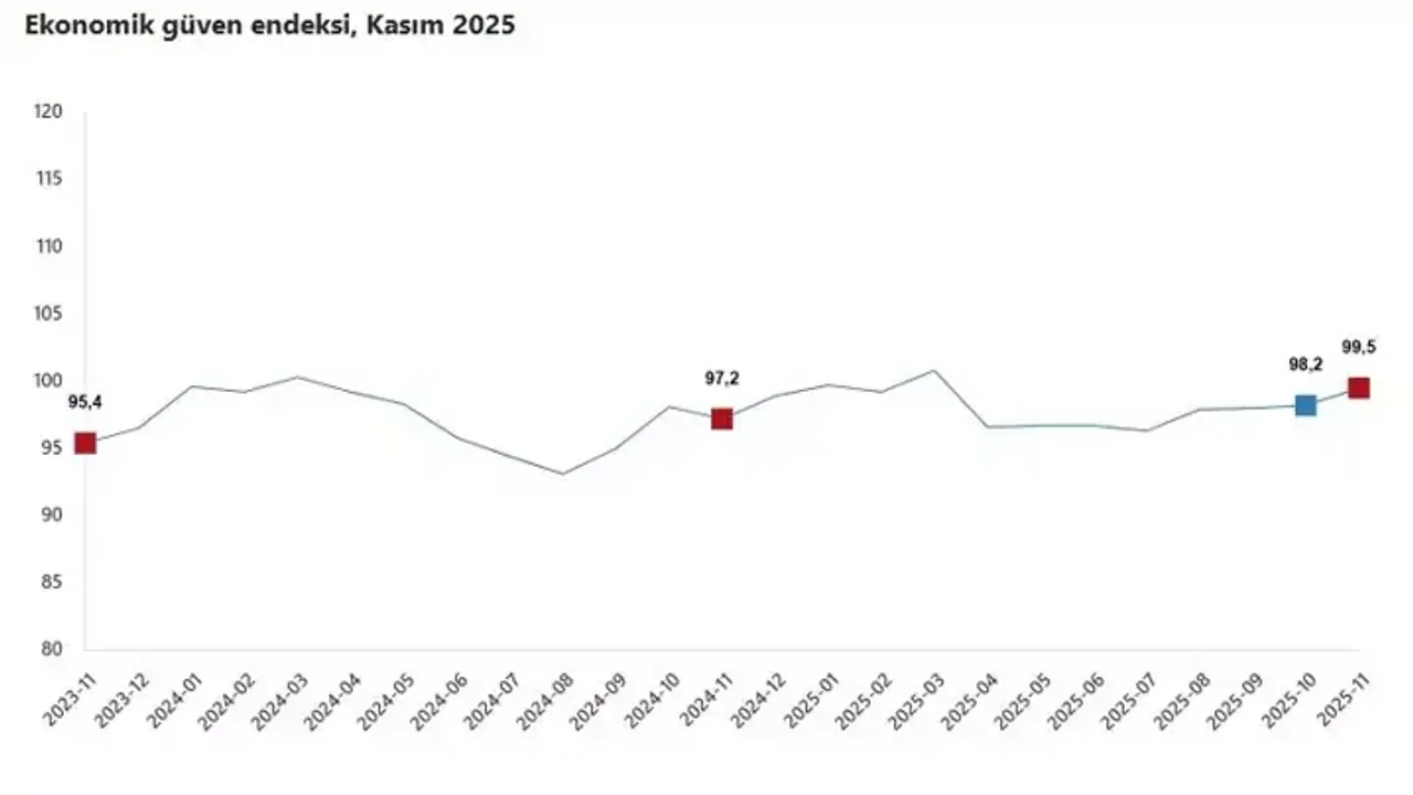 Buna göre ekonomik güven endeksi, bir önceki aya göre yüzde 1,3 artış göstererek 99,5 seviyesine ulaştı.