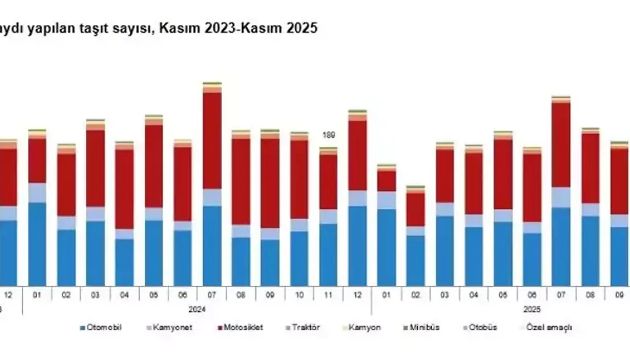 Kasım ayında trafiğe kaydı yapılan taşıt sayısı geçen yılın aynı ayına göre ise yüzde 3,1 azaldı. Bu dönemde özel amaçlı taşıtta yüzde 200, kamyonette yüzde 19,8, otomobilde yüzde 13,1, kamyonda yüzde 4,1 ve otobüste yüzde 0,2 artış görülürken; traktörde yüzde 35,4, motosiklette yüzde 25,4 ve minibüste yüzde 25,3 düşüş yaşandı.
