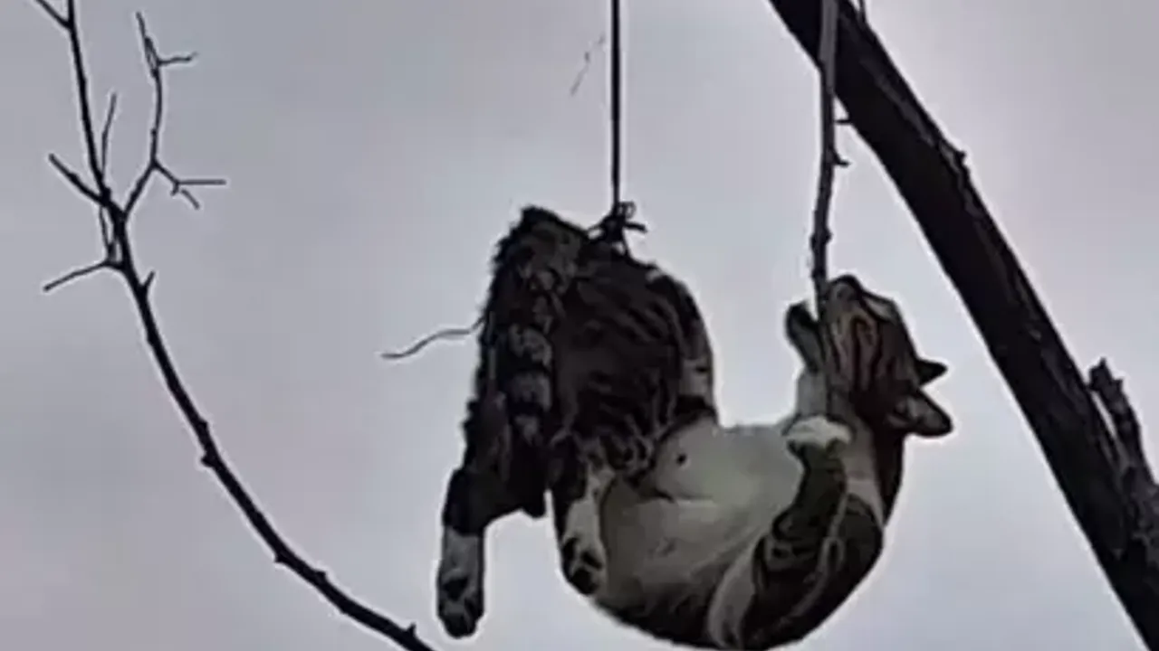 Kerimbey Mahallesi Güneş Caddesi üzerinde bir ağaca asılı şekilde bulunan kedi, çevredeki vatandaşlar tarafından fark edildi. Kedinin hem ayaklarından hem de başından bir şekilde ağaç dalına asılı olduğu görüldü.