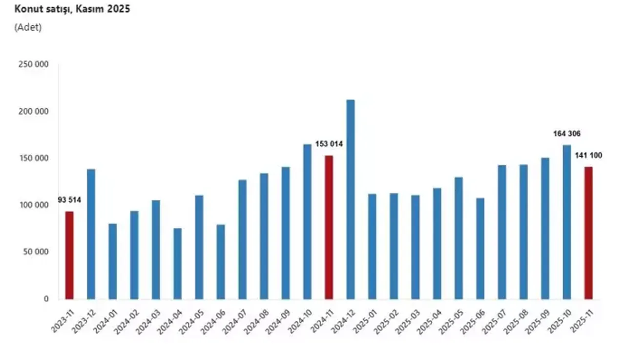 Buna göre, Türkiye genelinde konut satışları kasım ayında bir önceki yılın aynı ayına göre yüzde 7,8 azalarak 141 bin 100 olarak gerçekleşti.
