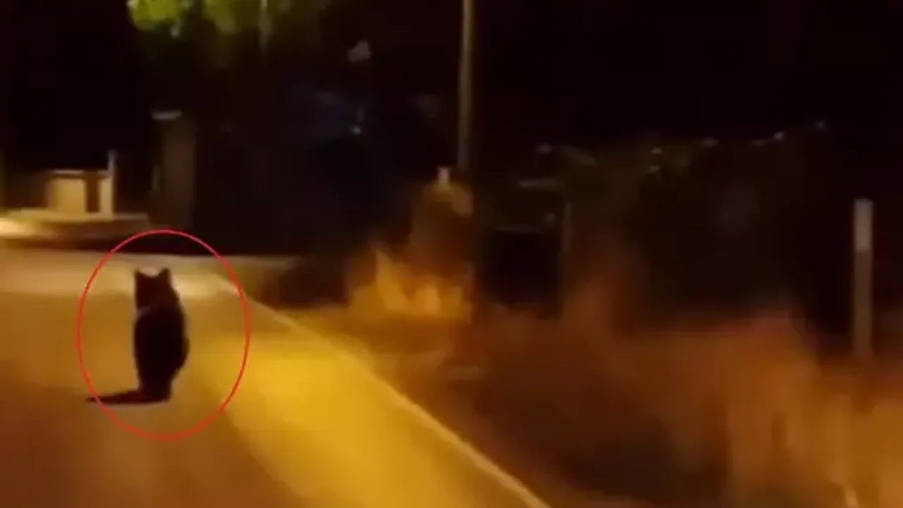 Akşam saatlerinde yaşanan olayda, otomobiliyle ilerleyen bir vatandaş, yol üzerinde aniden beliren ayıyı fark etti. Korkup kaçmaya başlayan ayı, çalılıklara girmeyi başaramayınca yol boyunca koşarak uzaklaştı. Ayının panik anları saniye saniye cep telefonu kamerasına yansıdı.