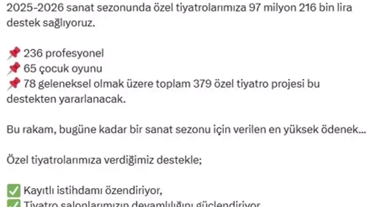 Başvuru sürecinde 434 özel tiyatrodan 400’ü değerlendirmeye alınırken, 379 proje desteklenmeye hak kazandı. Destek verilen projeler arasında 236 profesyonel, 65 çocuk oyunu ve 78 geleneksel tiyatro yer alıyor. Bakanlık, bu desteklerle tiyatro sektöründe kayıtlı istihdamı artırmayı, özel tiyatro salonlarının sürekliliğini sağlamayı ve Türk tiyatrosunun gelişimine katkıda bulunmayı hedefliyor. Detaylara Kültür ve Turizm Bakanlığı Güzel Sanatlar Genel Müdürlüğü’nün resmi web sitesinden ulaşılabiliyor.