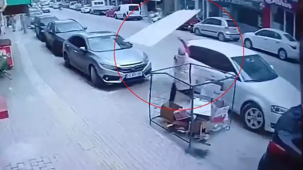 Balıkesir Caddesi’nde park halindeki otomobiline doğru giden bir kadın, çatıdan kopan sacın altında kalmaktan saniyelerle kurtuldu.