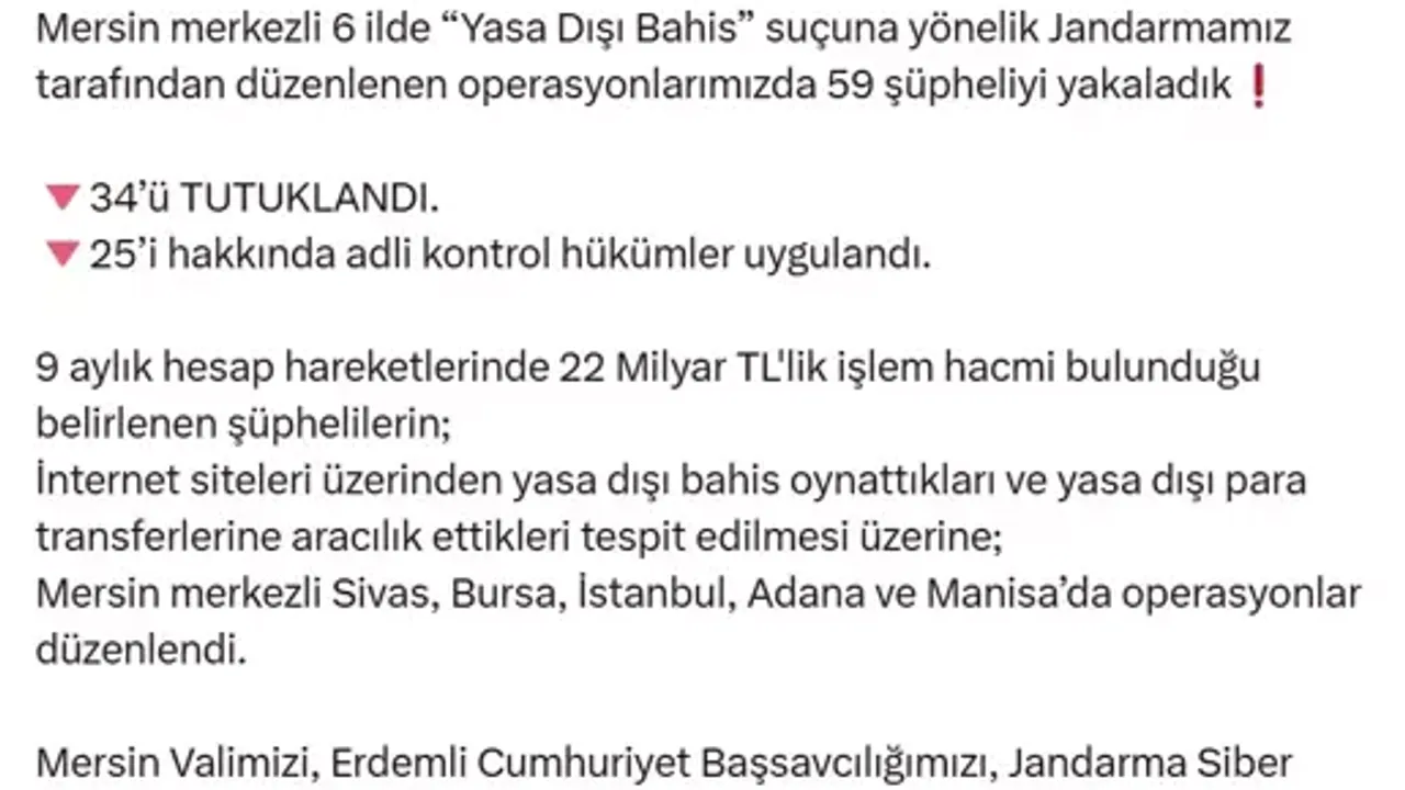 B. Y., sosyal medya hesabından yaptığı açıklamada, şüphelilerin internet siteleri üzerinden yasa dışı bahis oynattıklarının ve yasa dışı para transferlerine aracılık ettiklerinin tespit edildiğini belirtti.