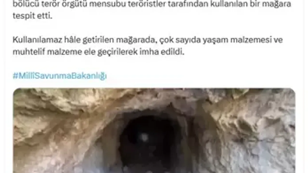 Paylaşımda, Türk Silahlı Kuvvetleri'nin bölücü terör örgütüne ait sığınak ve barınaklara yönelik operasyonlarının kararlılıkla sürdüğü vurgulandı. Bakanlığın sosyal medya üzerinden yaptığı açıklamada, Mehmetçiğin terör örgütü PKK tarafından kullanılan bir mağarayı ortaya çıkardığı belirtildi. Açıklamada, "Kahraman Mehmetçik, Irak'ın kuzeyinde yürüttüğü operasyonlarda teröristlerin barındığı alanlara girmeye devam ediyor. Pençe-Kilit bölgesinde tespit edilen mağara, kullanılamaz hale getirildi. Mağara içerisinde çok sayıda yaşam malzemesi ve çeşitli eşyalar ele geçirildi ve imha edildi" ifadeleri yer aldı. Operasyonlara ait görüntüler de kamuoyuna sunuldu.