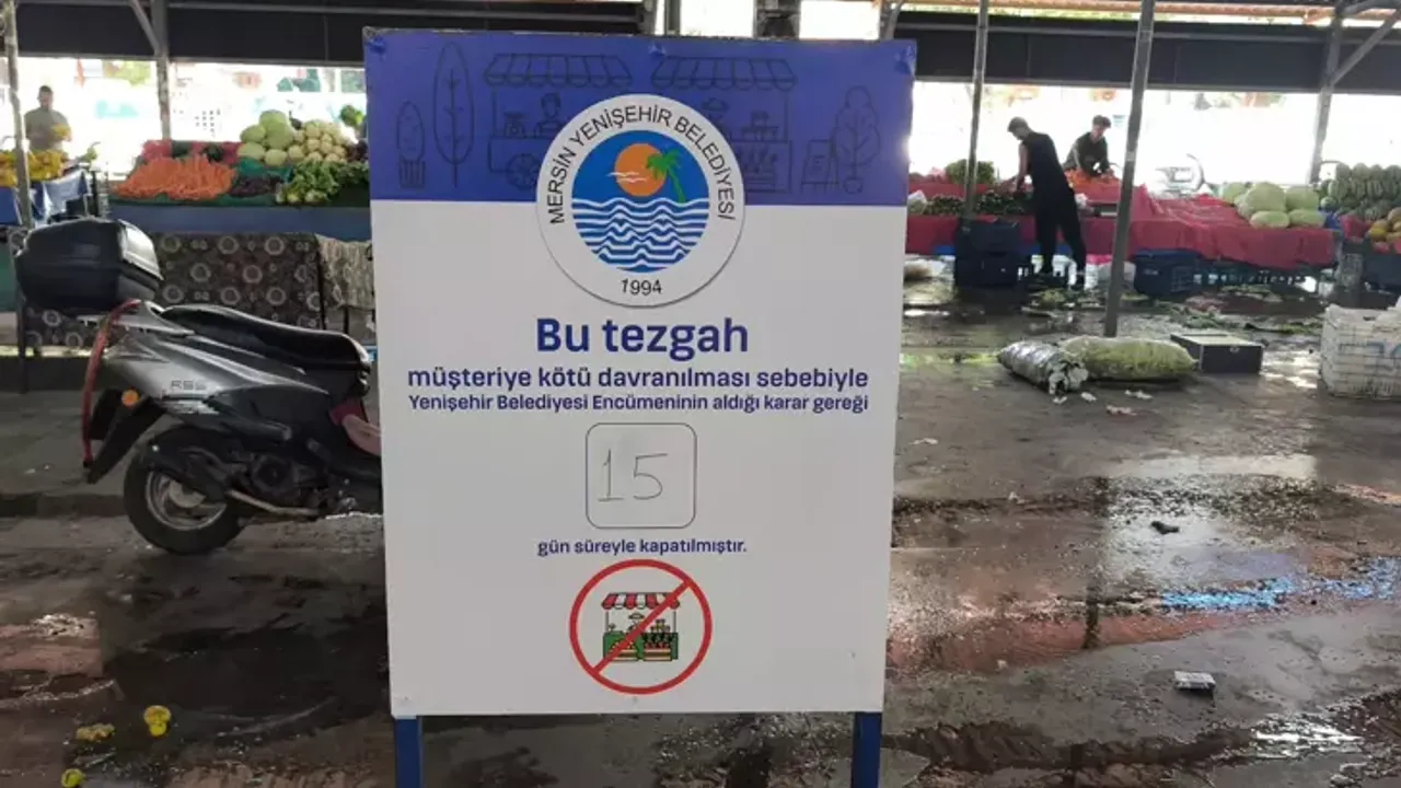 Ayrıca, esnafın tezgah kurduğu pazarlara “Bu tezgah, müşteriye kötü davranılması sebebiyle Yenişehir Belediyesi encümen kararıyla 15 gün süreyle kapatılmıştır” yazılı tabelalar bırakıldı.