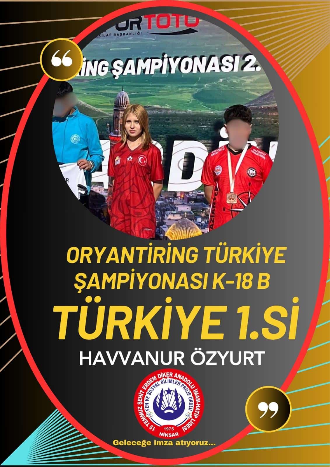 Niksar 15 Temmuz Şehit Erdem Diker Anadolu İmam Hatip Lisesi sporcusu Havvanur Özyurt, 22–23 Kasım tarihlerinde Mardin’de düzenlenen Türkiye Oryantiring Şampiyonası 2. Kademe Yarışlarında önemli bir başarıya imza attı.