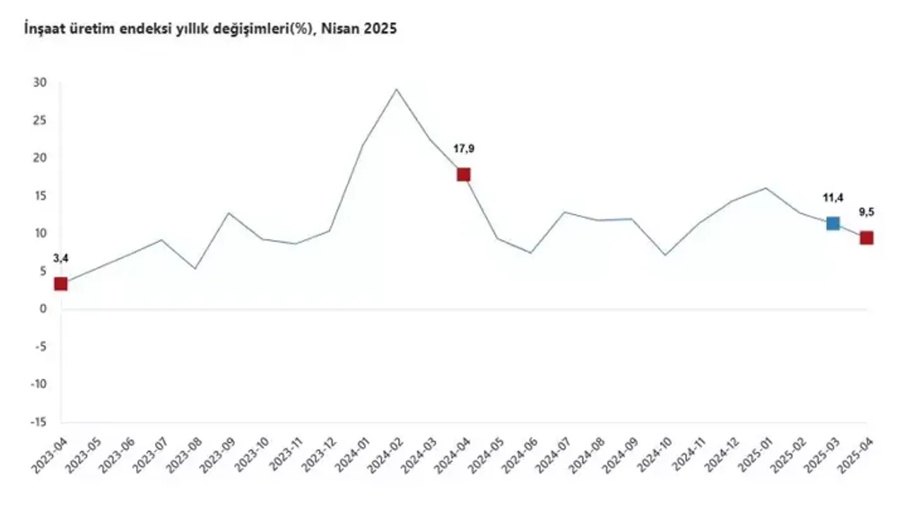 Verilere göre, sektörde yıllık bazda büyüme kaydedilirken, aylık bazda ise düşüş yaşandı. Nisan ayında inşaat üretimi, geçen yılın aynı dönemine göre yüzde 9,5 artış gösterdi. Alt sektörlere bakıldığında, bina inşaatı endeksi yüzde 11,6 oranında yükselirken, bina dışı yapıların inşaatında yüzde 1,9’luk artış görüldü. Özel inşaat faaliyetlerinde ise yüzde 7,5 oranında artış kaydedildi. Ancak aylık verilere göre, inşaat üretimi bir önceki aya kıyasla yüzde 1,6 oranında azaldı. Bu dönemde bina inşaatı sektörü yüzde 1,9, bina dışı yapılar yüzde 1,1 ve özel inşaat faaliyetleri yüzde 1 oranında geriledi.