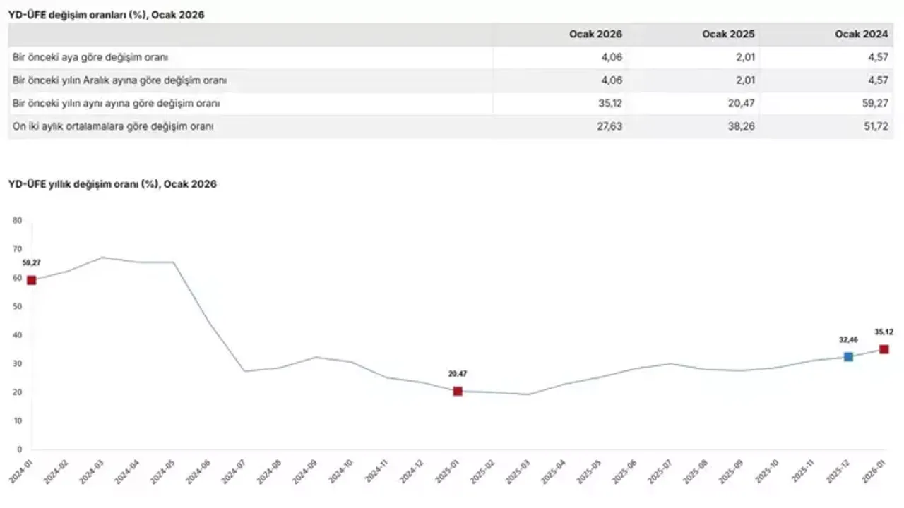 Buna göre, yurt dışı üretici fiyatları ocak ayında bir önceki aya göre yüzde 4,06, bir önceki yılın aynı ayına göre yüzde 35,12 ve 12 aylık ortalamalara göre yüzde 27,63 oranında arttı.