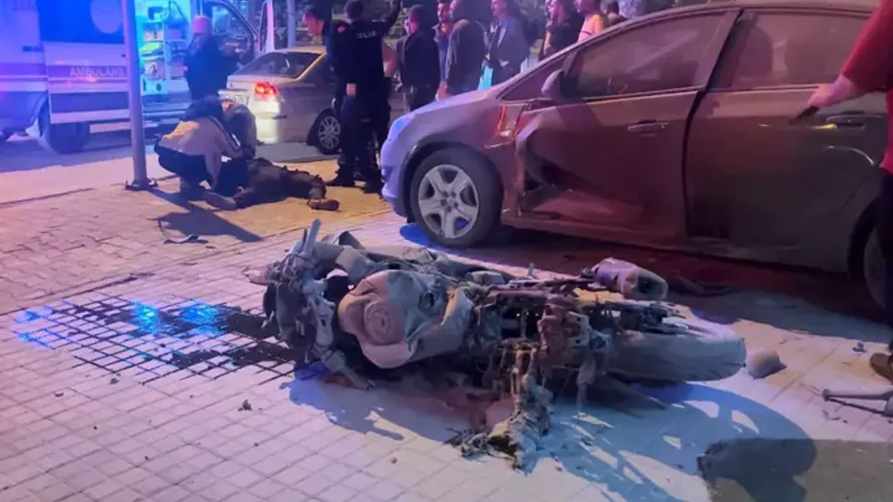 Çarpışmanın etkisiyle savrulan motosiklet, park halindeki araçlara çarparak alev aldı. Motosiklet sürücüsü ise yola savrularak ağır yaralandı.