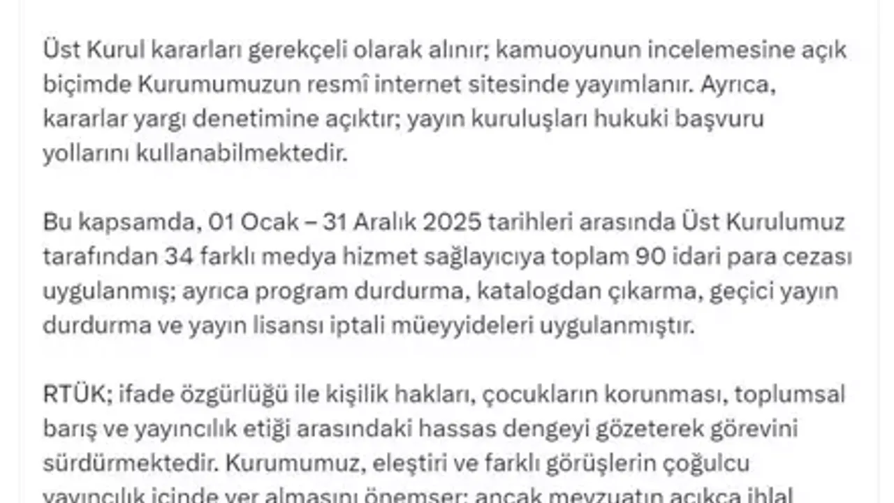 Daniş’in paylaştığı bilgilere göre, 1 Ocak – 31 Aralık 2025 tarihleri arasında RTÜK tarafından 34 farklı medya hizmet sağlayıcıya toplam 90 idari para cezası uygulandı. Bunun yanı sıra program durdurma, katalogdan çıkarma, geçici yayın durdurma ve yayın lisansı iptali gibi çeşitli yaptırımların da hayata geçirildiği belirtildi. Uygulanan müeyyidelerin, yayın içeriklerinde tespit edilen ihlaller doğrultusunda alındığı kaydedildi.