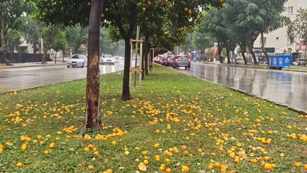 Meteoroloji 4. Bölge Müdürlüğü’nün uyarısının ardından öğle saatlerinde başlayan sağanak ve yer yer gök gürültülü yağış, kuvvetli rüzgarla birlikte turunç ağaçlarının meyvelerinin dökülmesine neden oldu. Turuncu rengi ve görselliğiyle caddeleri süsleyen turunçların refüjlere saçılmış görüntüsü ise ortaya farklı bir görsel güzellik çıkardı.