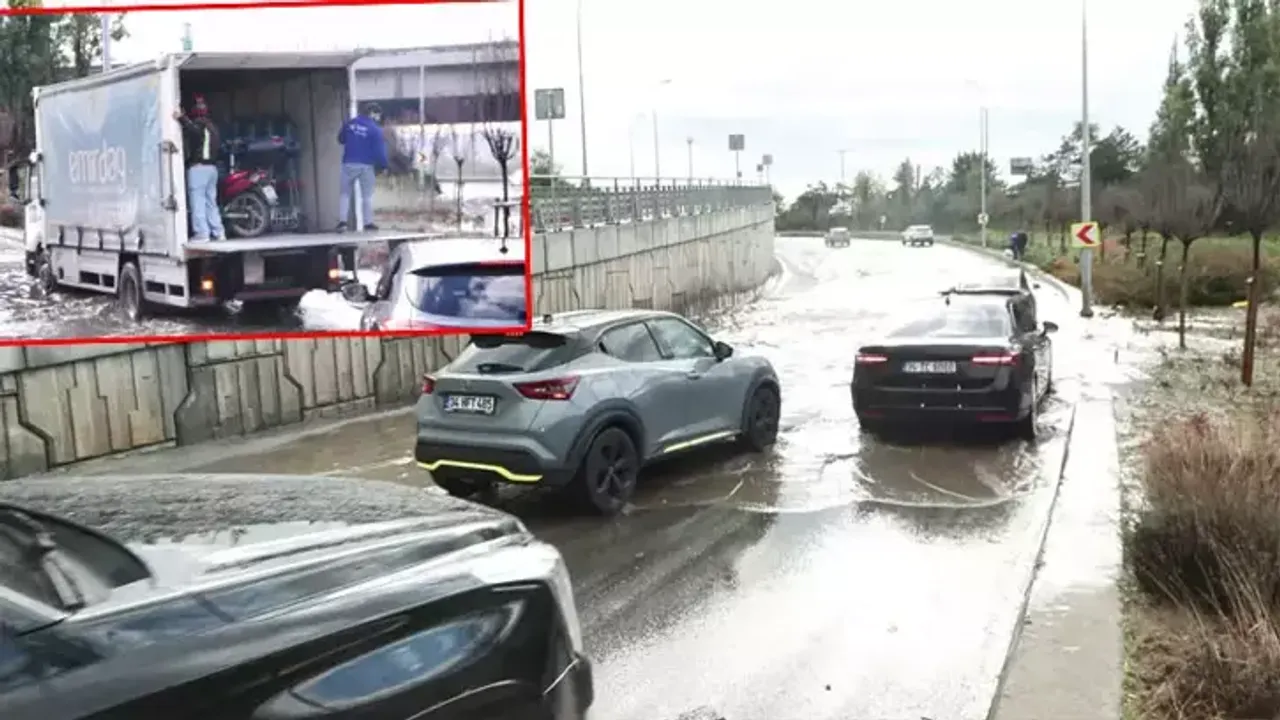Bahçeşehir’de yan yolda biriken su, sürücülere zor anlar yaşattı. Özellikle motosikletliler, suyla kaplı yolda ilerlemekte güçlük çekti.