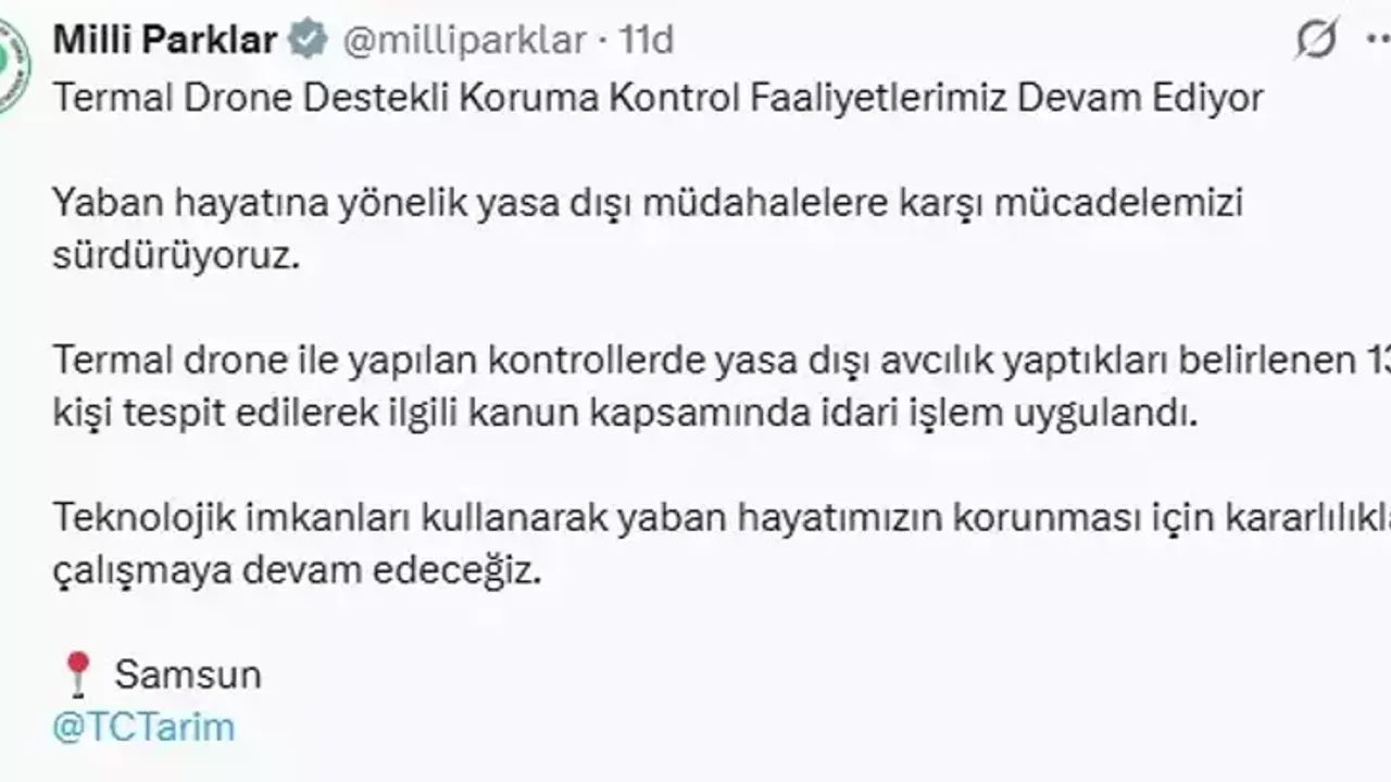 DKMP Genel Müdürlüğü, sosyal medya hesabından yaptığı açıklamada, yaban hayatının korunmasına yönelik çalışmaların kararlılıkla sürdürüldüğünü duyurdu. Açıklamada, termal dronlarla yapılan kontroller sayesinde yasa dışı müdahalelerin hızlı bir şekilde tespit edildiği belirtildi. Özellikle gece ve alçak ışık koşullarında avcılığı belirlemede dron teknolojisinin büyük avantaj sağladığı vurgulandı.