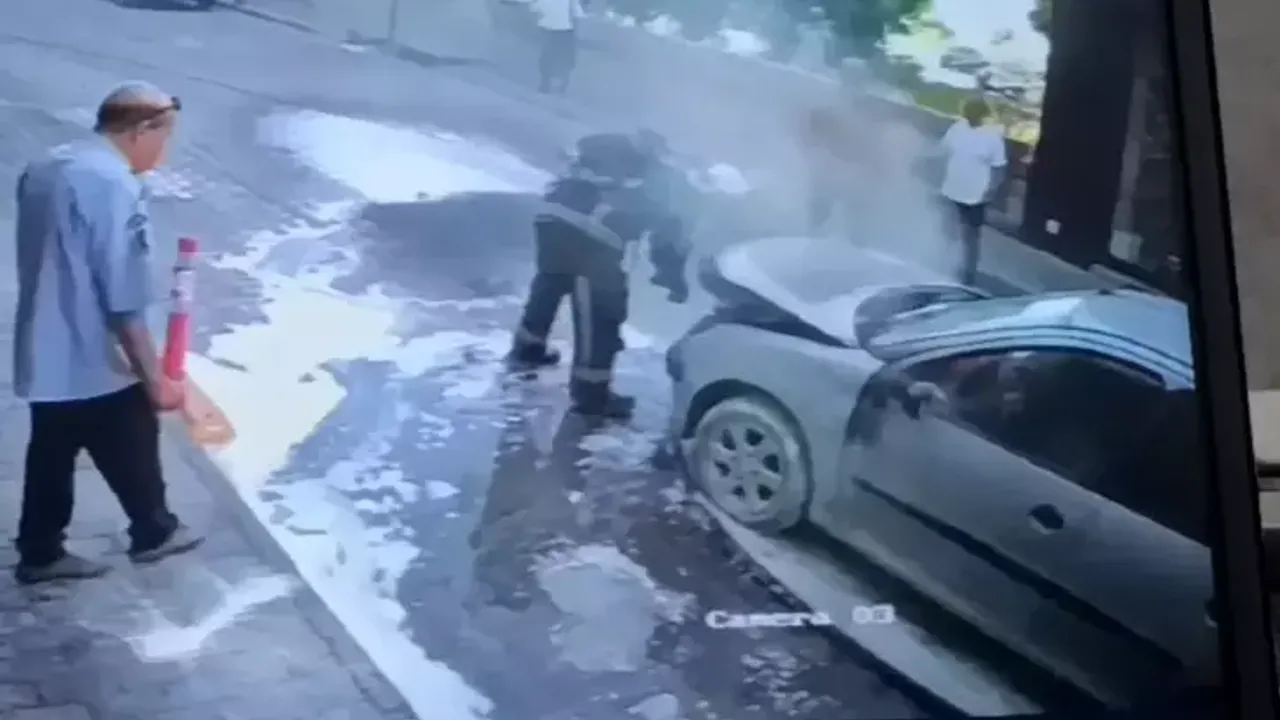 Yangın nedeniyle araçta maddi hasar meydana gelirken, yangının çıkışı ve söndürme anları bir iş yerinin güvenlik kamerasına yansıdı.