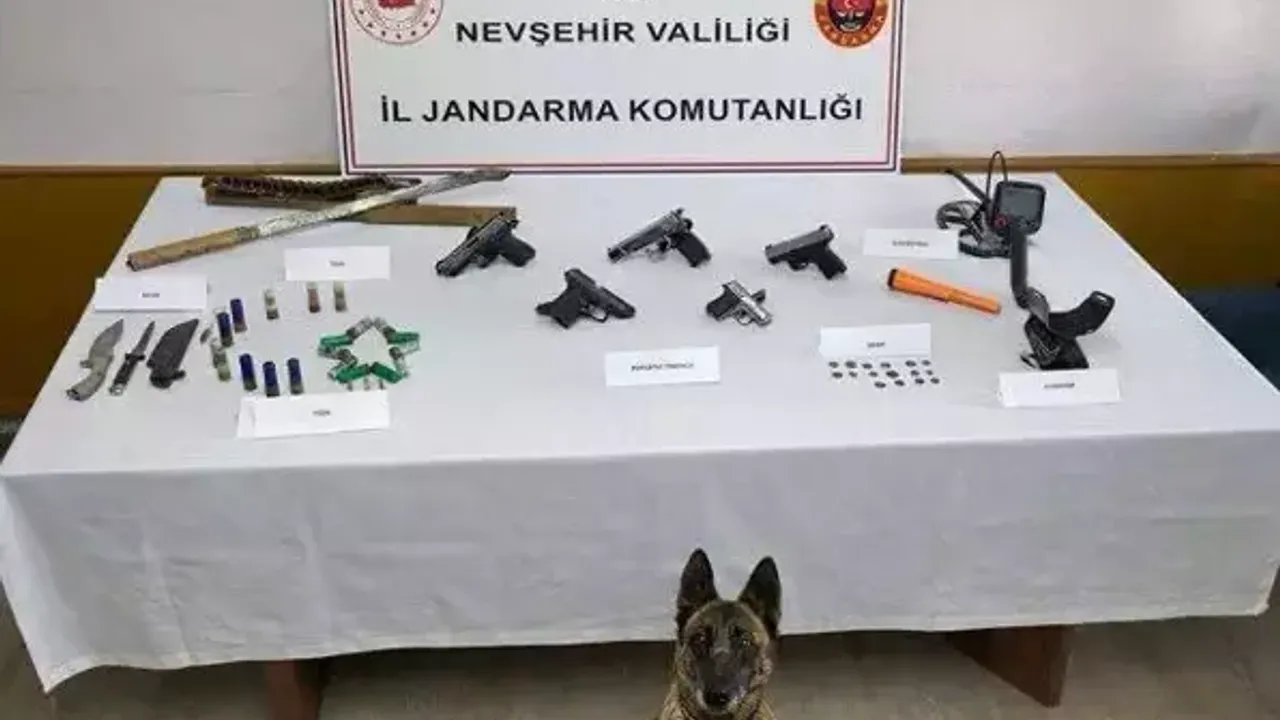 Nevşehir İl Jandarma Komutanlığı ekipleri, S.Ç., T.Y., T.E. ve S.K. isimli şüphelilerin silah ticareti ve tarihi eser kaçakçılığı yaptıkları bilgisi üzerine çalışma başlattı. Yapılan titiz araştırmalar sonucunda Derinkuyu ilçesi Yazıhüyük beldesinde şüphelilere ait olduğu belirlenen adrese eş zamanlı operasyon düzenlendi.