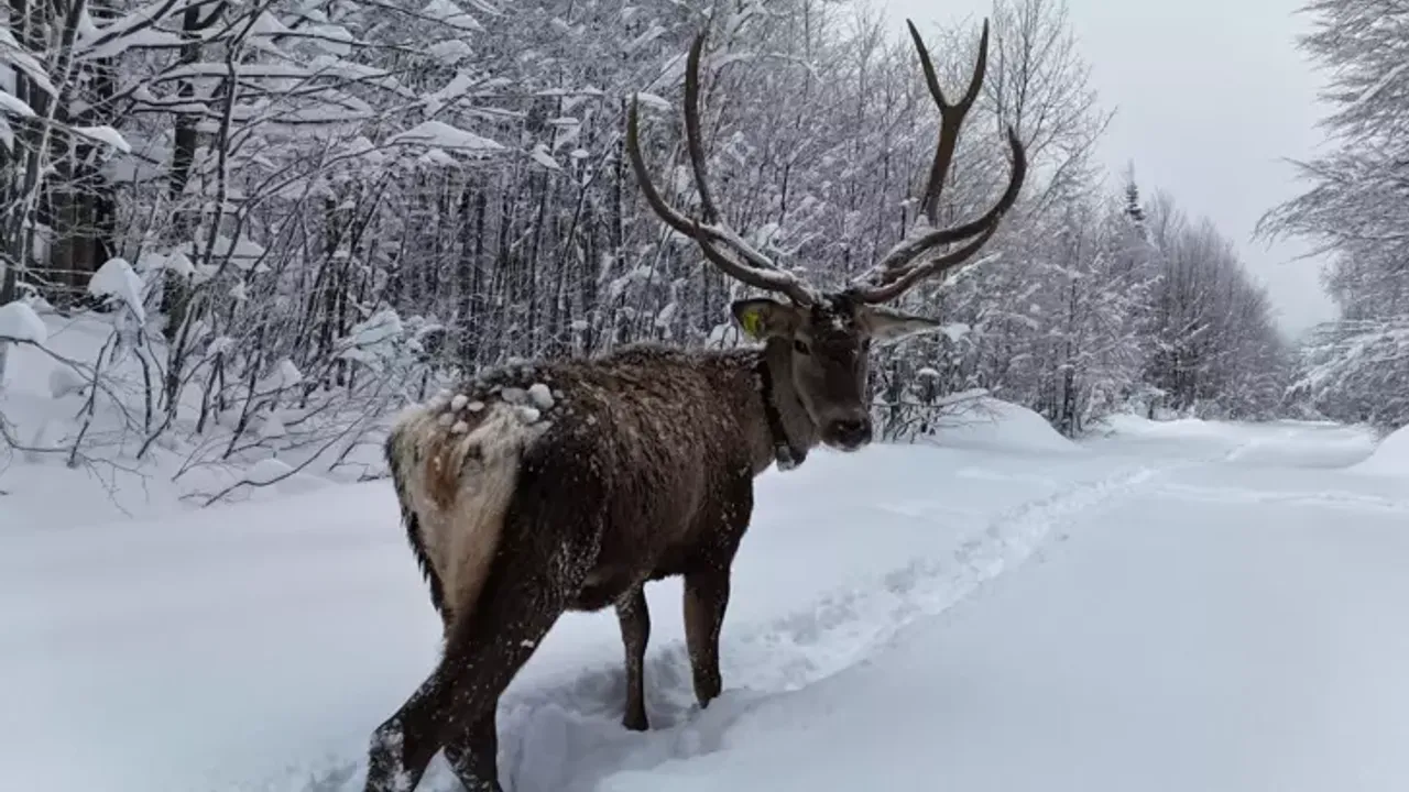 Bölgede kar kalınlığının 50 santimetreyi aştığı belirtilirken, doğal güzellikler adeta kartpostallık bir görüntü oluşturdu. Karla kaplanan ormanlık alanda bir kızılgeyiğin yürüyüşü ise dron ile kaydedildi. Dronun yüksekten çektiği görüntülerde, geyik karla kaplı zeminde adeta iz bırakarak ilerledi.