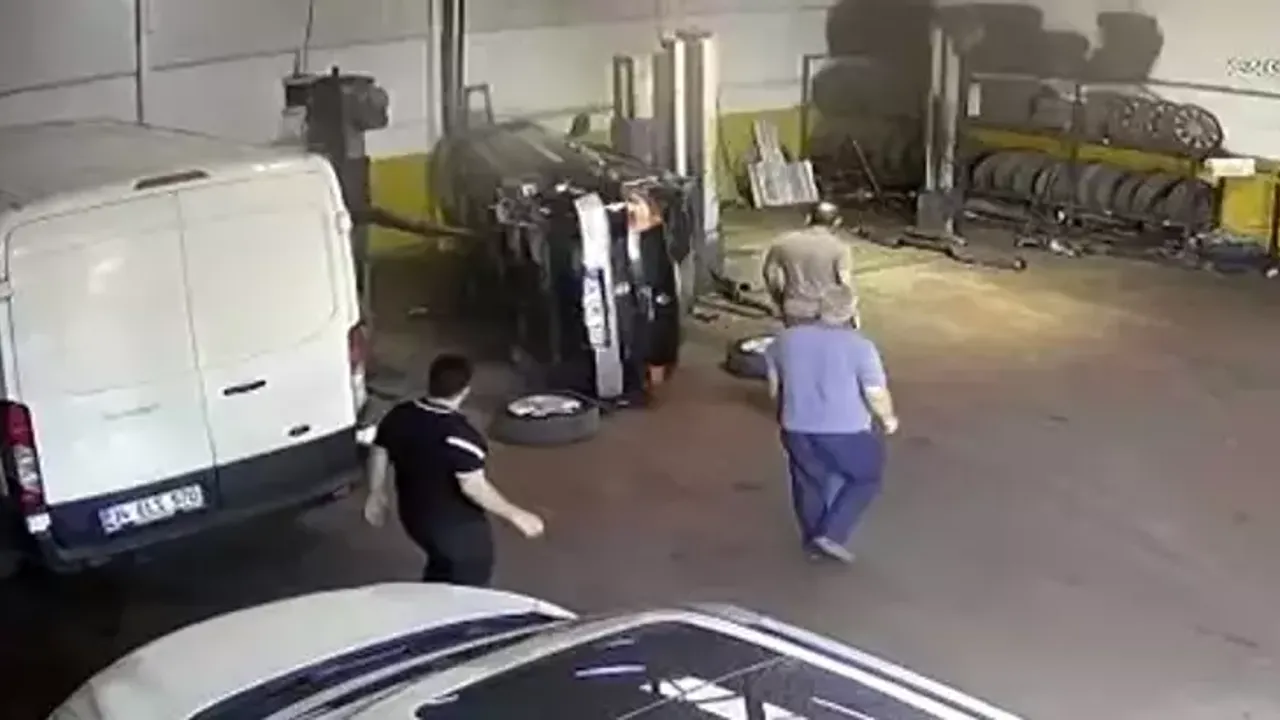 Tamir amacıyla servise getirilen otomobil, kaldırma lifti üzerine alındı. Onarım işleminin ardından aracı indirmek isteyen çalışanlar, olası risklere karşı araç altından uzaklaştı. Ancak bu sırada liftin dengesini kaybetmesi sonucu, yaklaşık 1 metre yükseklikteki araç aniden yere çakıldı.