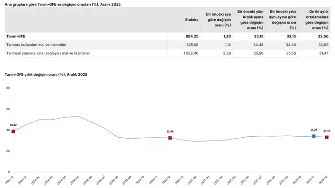 Buna göre, tarımsal girdi fiyatları yıllık bazda yüzde 33,15 artarken, bir önceki aya göre artış yüzde 1,30 olarak gerçekleşti. 12 aylık ortalamalara bakıldığında ise fiyat artışı yüzde 32,50 seviyesinde oldu.