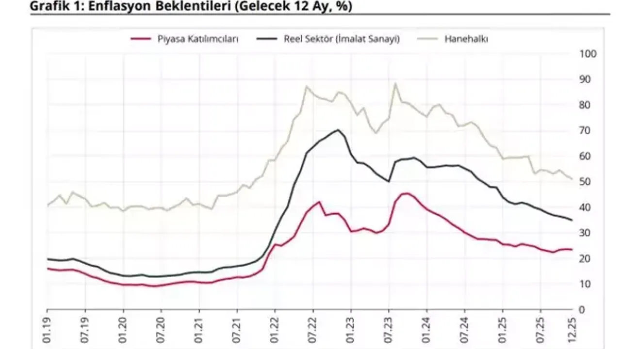 Rapora göre, önümüzdeki 12 aya ilişkin enflasyon beklentileri, piyasa katılımcıları, reel sektör temsilcileri ve hanehalkı açısından bir önceki aya kıyasla azalma gösterdi.