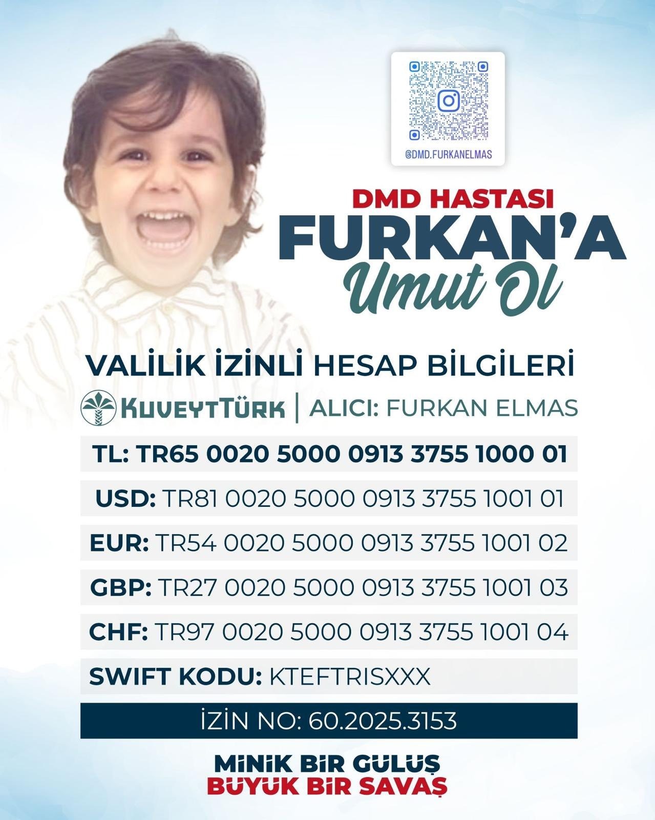Bir bankada çalışan Mustafa Elmas (37) ile öğretmen Rabia Elmas'ın (33) 2'nci çocuğu Furkan Elmas'a, 9 aylıkken genetik kas hastalığı olan DMD teşhisi konuldu. Hastalığı nedeniyle zor günler yaşayan Furkan'ın, yurt dışında yapılan gen tedavisine ulaşabilmesi için Tokat Valiliği onaylı kampanya başlatıldı. 20 gün önce başlatılan kampanyada tedavi için gerekli olan 120 milyon TL'nin yüzde 15'i toplandı. Ailesi, Furkan'ın yürüme yeteneğini tam olarak kaybetmeden 10 yaşından önce gen tedavisinden faydalanması için destek istedi.